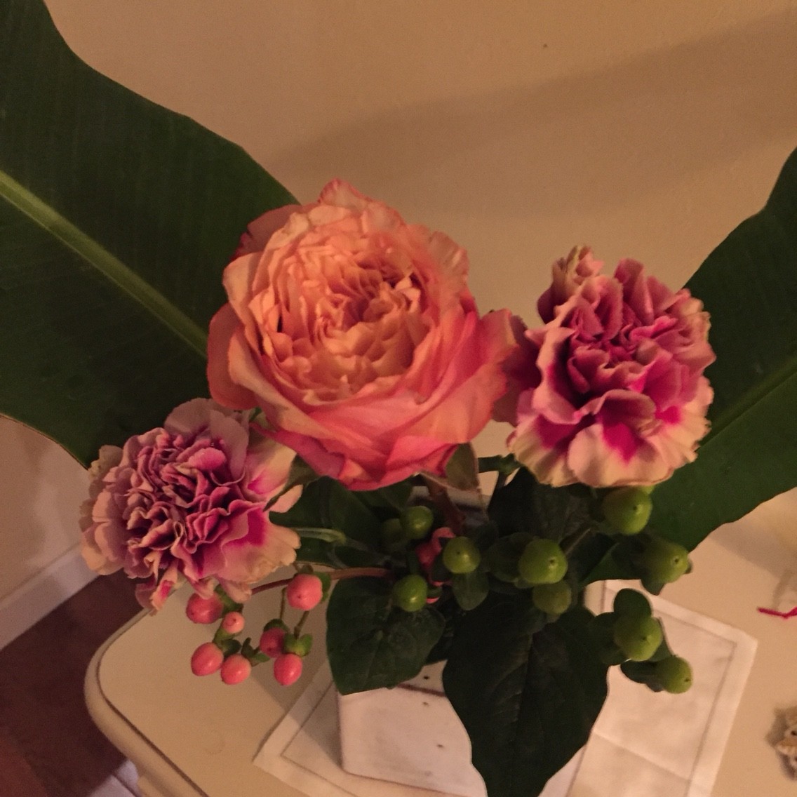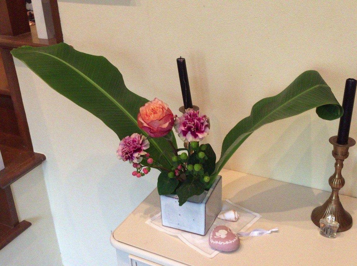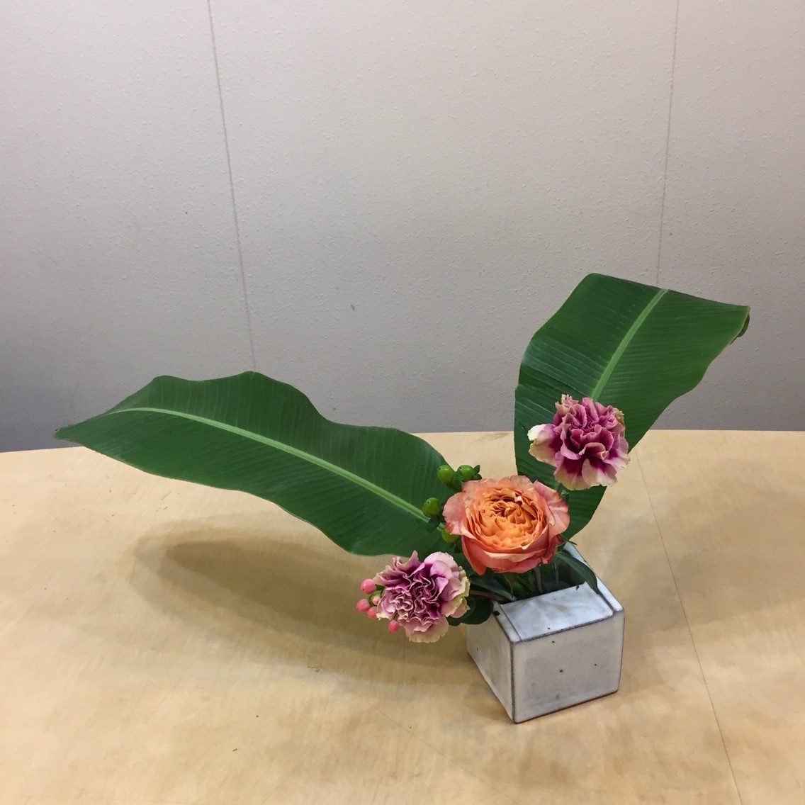 今回は自由花なので、普段あまり使ったことがない芭蕉などを使いつつ、色がモダンなローズとカーネーション、などで作りました。