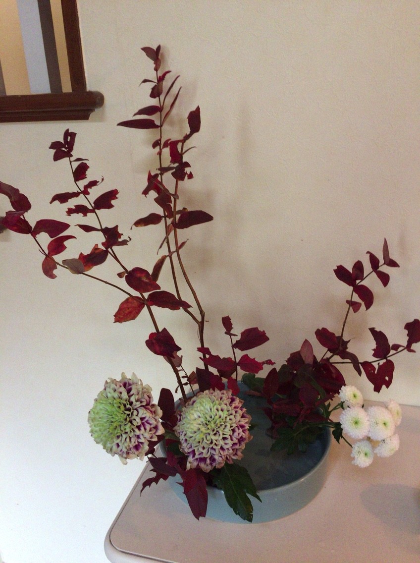- いけばな:ヒベリクムの紅葉 菊(マム)小菊 第5応用立真型・盛花 Variation NO.5 Upright Stayle Moribana