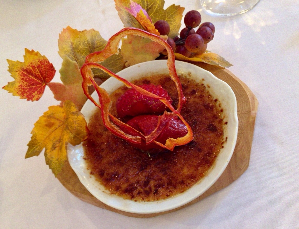 写真のデセール。フルムダンベールのクレーム・ブリュレ、赤ピーマンとフランボワーズのソルベ、黒イチジク、赤ピーマンのチップ、食べられる紅葉の葉と葡萄と、食べられない紅葉の葉と葡萄