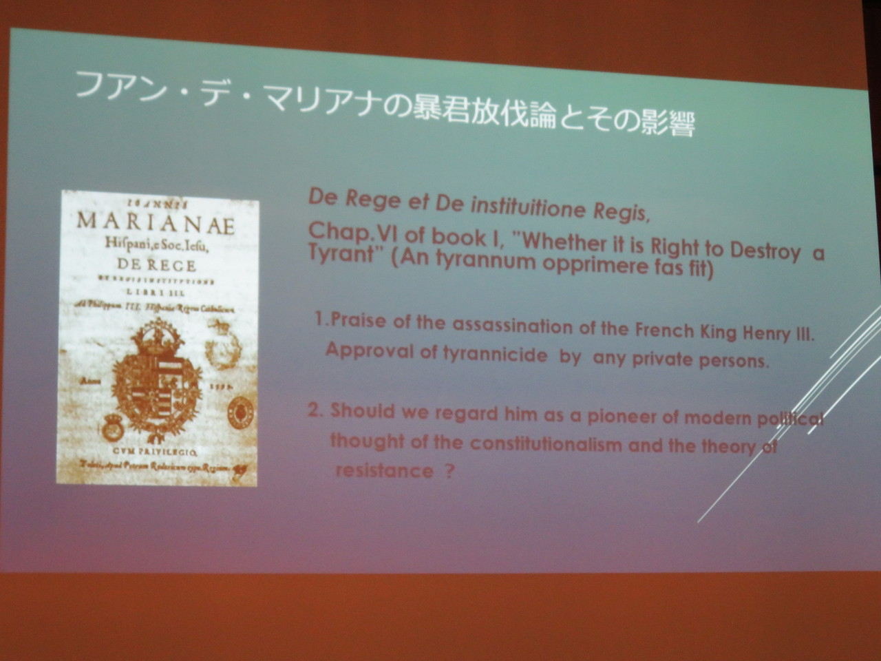 甚野先生が扱われた、ファン・デ・マリアナによる「暴君放伐」についてのテーマはフランス啓蒙思想への水脈としても関心があった。イエズス会は暴君放伐を認めており、そうなると暴君に対する進言などは日本史の中でも比較的16世紀には観られるように思うのだが、いまだマリアナの著作や暴君放伐論に対しての日本での研究はほとんどなく、かつ、日本では暴君放伐論がほとんど議論されてこなかったことはとても興味深い。
