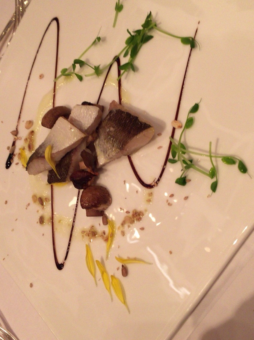 お魚料理はカマスの昆布しめ。菊とバルサミコ、きのこが添えられています。