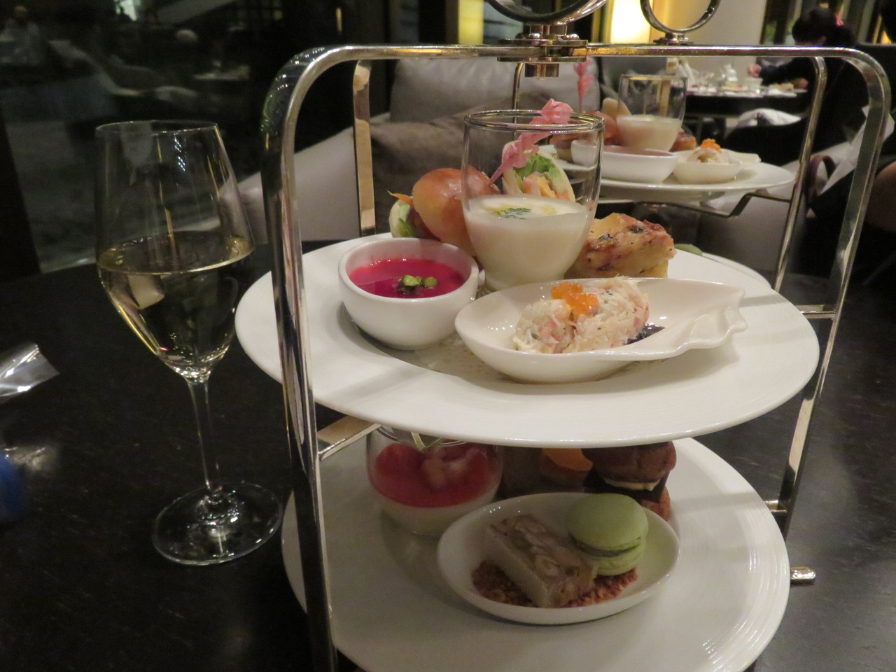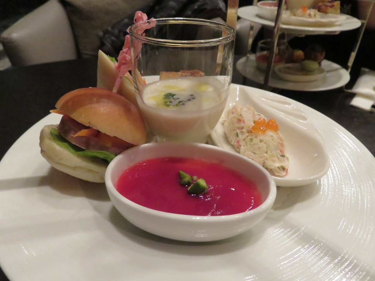 これぞシャンパンにあうメニュー。美味。フォアグラのムース、カリフラワーのスープ(キャビア添え)、ラップサンド、ミニバーガー。一段目はモエでゆっくり楽しみたいところです。