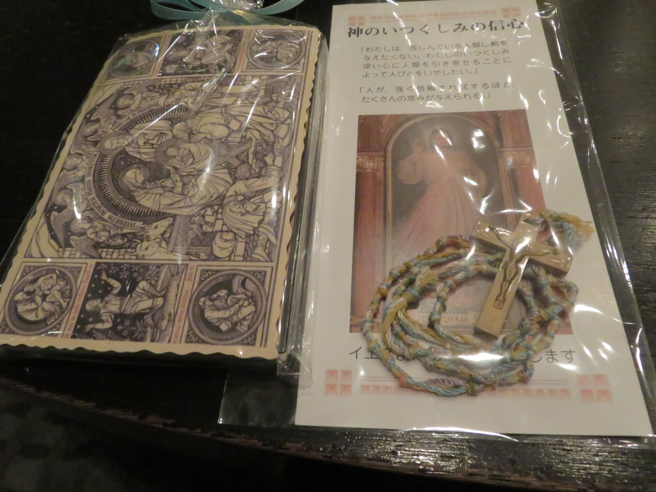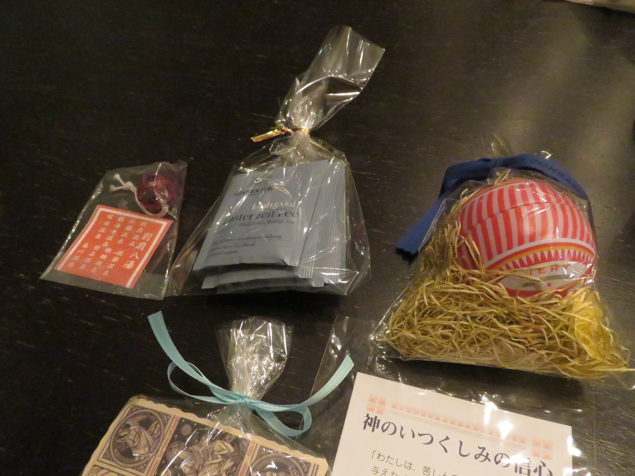 24日にお会いする予定だったのですが、私が体調がこの週が本当にいまいちで、・・・・Sさまから混乱ショップのオーナメントや、手作りのロザリオ、聖ヒルデガルドのお茶、大分の鈴に、フランス伝統の装幀のダイアリーとプレゼントを頂きました。私からはテラクオーレのダマスクローズのオーガニックハーブティ、同じくオーガニックのトリノのチョコレート、オーガニックコットンのポーチ(これが旅に役立つ)と京都のお土産を少々。