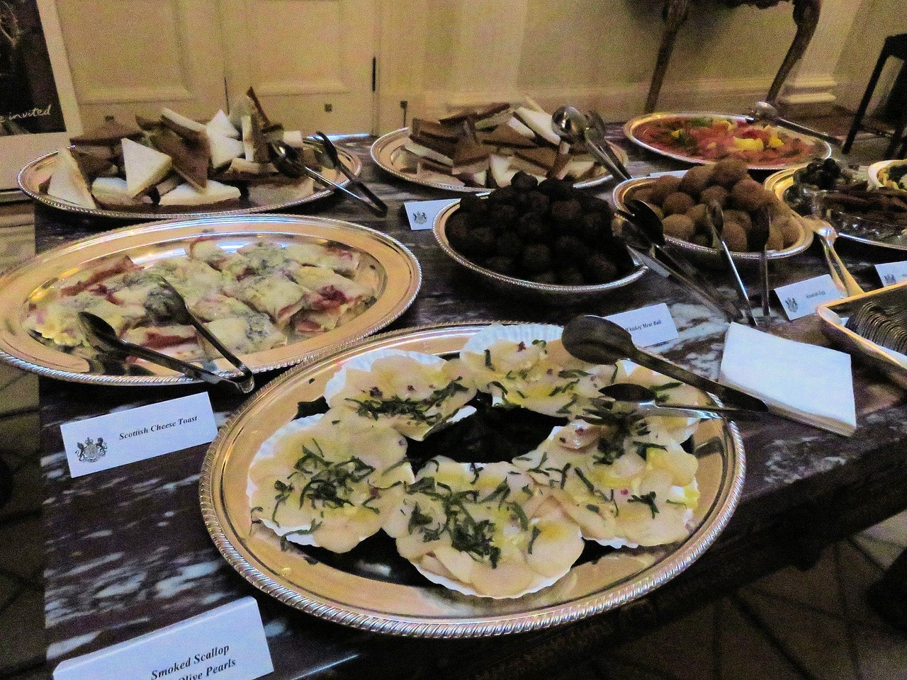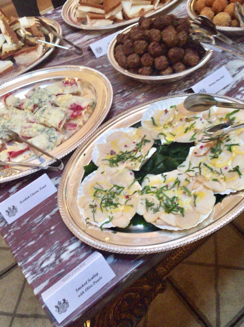 2月16日昼に行われたエジンバラ・フェスメディアイベントの後半は、スコットランドのお料理をビュッフェ形式で頂きました。スコットランドサーモン、スコッチエッグをはじめウィスキー・ミートボール、帆立のスモークなどシーフード、ウィスキーにも合いそうなお料理が並びました。うずらのスコッチエッグ、ウィスキー・ミートボールは初めていただきましたが、英国Pub、モルトウィスキーやエールが出るお店で頂きたくなります。