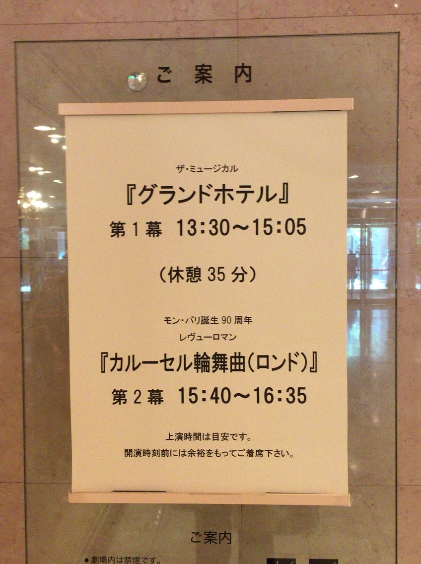 同窓会(三田会)のK様ほか初宝塚の方も御一緒に、また前回の信長や宙組公演も御一緒した観劇歴1年から2年の方もお誘いして、テレビ放送以外では初のグランド・ホテルと「カルーセル円舞曲」。