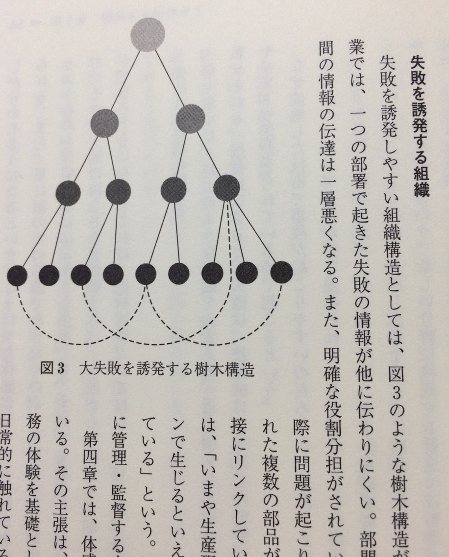 詳しくはぜひ本書を通読してほしいのだが、この失敗を誘発する組織の図をみてほしい。いわゆるトップダウン式であり、仮に(便宜上右とか下という語を用いる)右下の末端の部署あるいは役割をもつ人がミスをするとする。問題が全体に関わるため上に報告すればよいのだが、仮に上に報告することが自らの保身や上司(便宜上こう呼ぶ)が自らの監督不行き届きを懸念してさらに報告をしないで済ます場合、問題はまったく共有されなくなってしまう。中心にちかい部分がフレキシブルに機能し、報告を正確に把握してさらに報告し、その解決方法が組織で共有されて解決の方法をとれば、問題はない。しかしこの組織図ではトップは何をしらないことが増え、トップダウン方式ゆえに下からの、つまり現場からの声は届かないことになる。常に状況に応じて問題解決していくのが望ましいのだが、気が付くと手遅れ...これはかつて失敗し、消滅した日本企業に多い図式であり、多くの病院でもこのシステムをとっていることが多い。臨床の情報がまったく伝わらず、かといって現場の裁量は大変に小さく、何もできない。