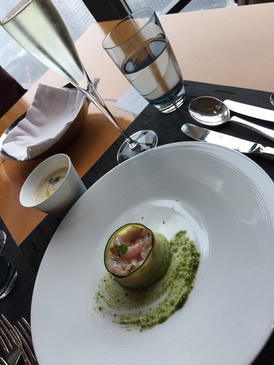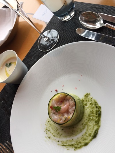 アペタイザー、前菜に海老とズッキーニの冷製。白人参のスープには少しビーツらしいものもはいっていて、スプーンですくうときに、ビーツのほのかな赤色が。春らしいやさしいスープです。