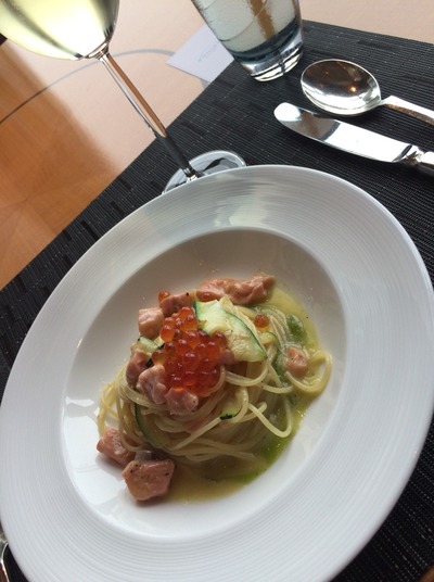 プリモ・ピアットにパスタ。チョイス可能で私はズッキーニとサーモン、いくらを使ったスパゲティーニ。