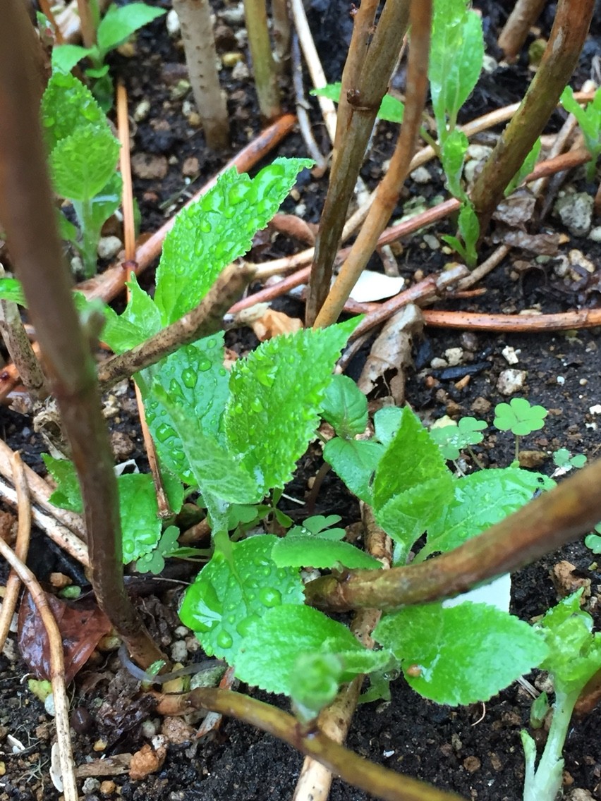 アナベルの新芽。今年は新しい枝もでてきています。アナベルに関しては心配なさそうです。