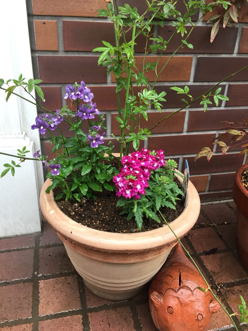 もっこうばらの植え付けをしたテラコッタの鉢。バーベナを回りにいれたコンテナ仕立てにしています。