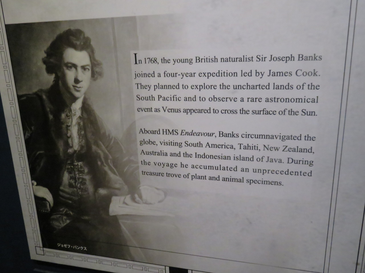 写真は、バンクス(Joseph Banks)の展示パネルです。バンクス花譜集は、以前、Bunkamuraでも展示がありました。南米、ニュージーランド、タヒチなどをめぐり精緻な植物画が有名です。いわゆるボタニカルアートとはまた違い、南洋の未知だった植物が描かれています。