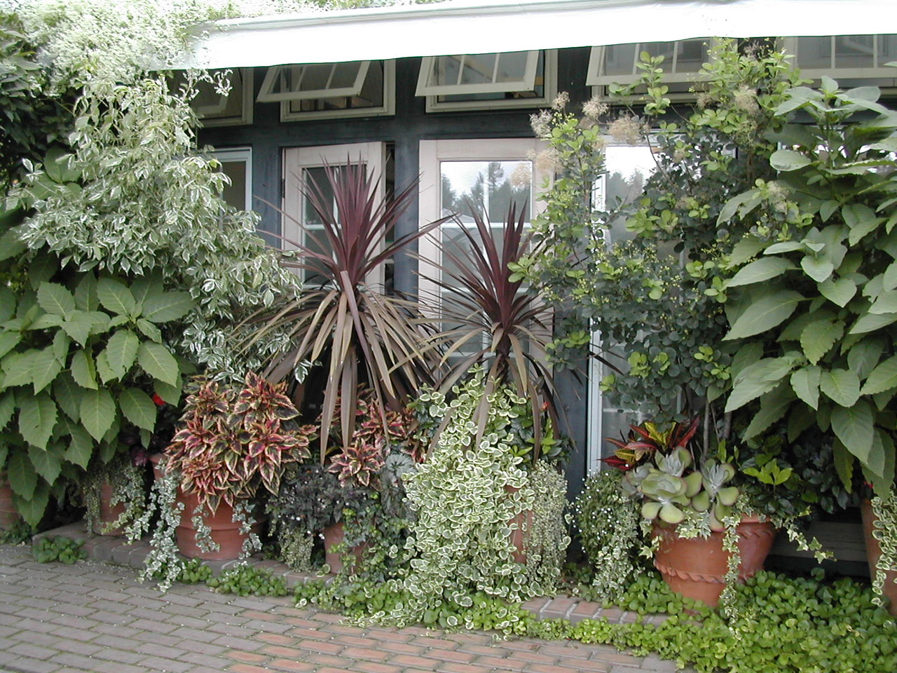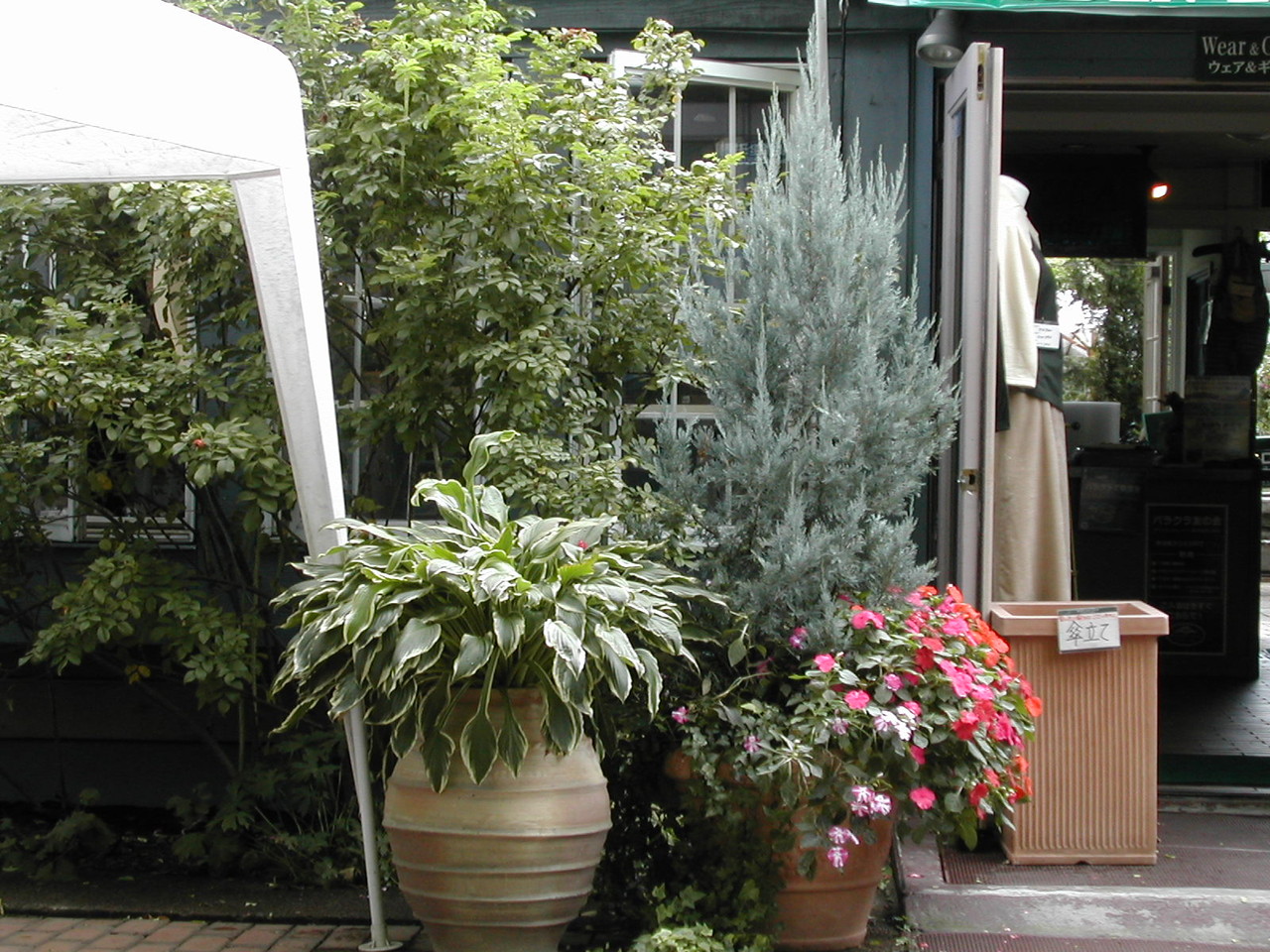 エントランス側のギボウシや寄せ植え。