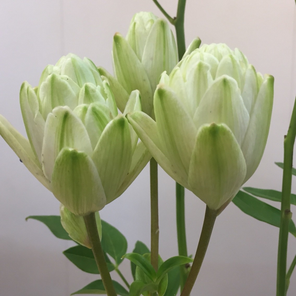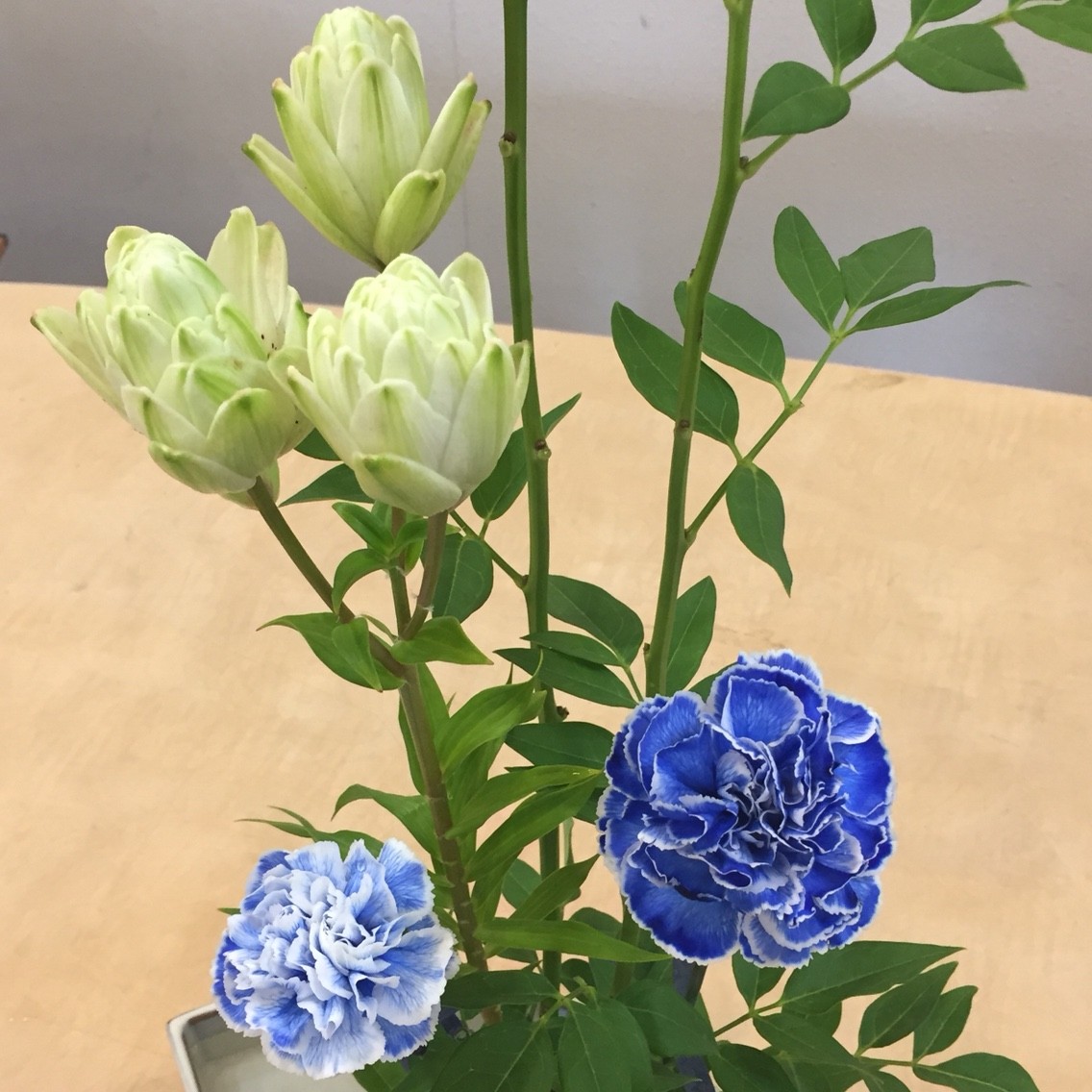 ノーブルリリーの凜としながらつぼみの形と色にひかれ、それにあうまっすぐなそけい、濃淡の違う青いカーネーションを選びました。
