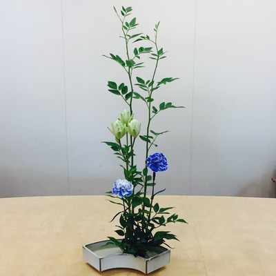 花型から離れ、造形要素が増えてきます。しかしながら花や枝、植物の自然さと特性を活かして、テーマある仕上げ、奥行き、花の在りかたで表現するのは花型法にも共通するような。