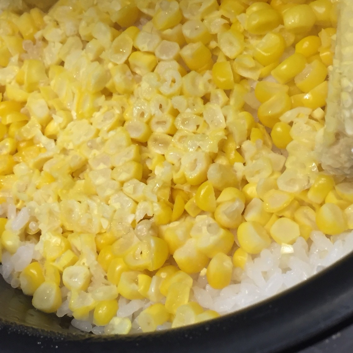 とうもろこしを削いで、一緒に炊きます。