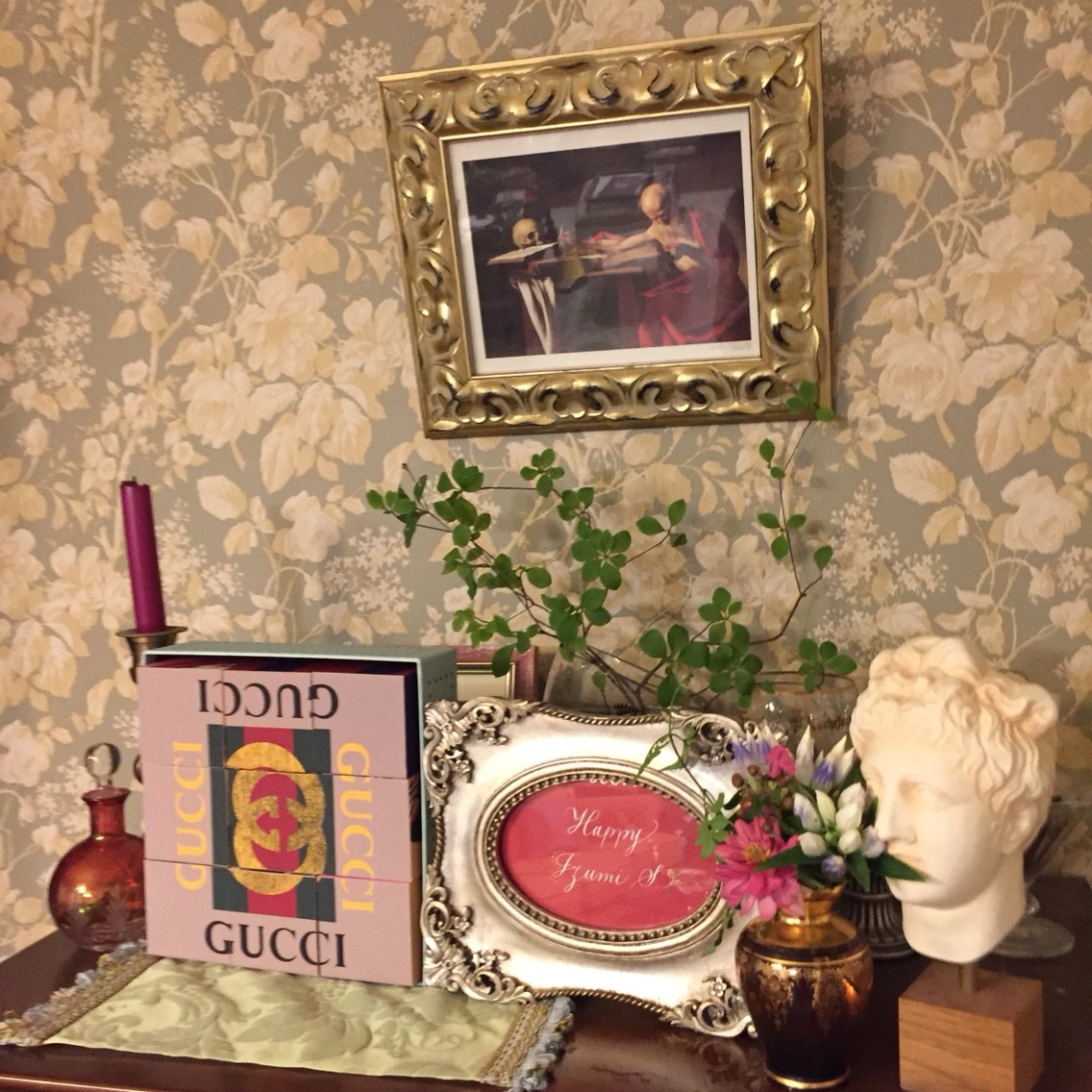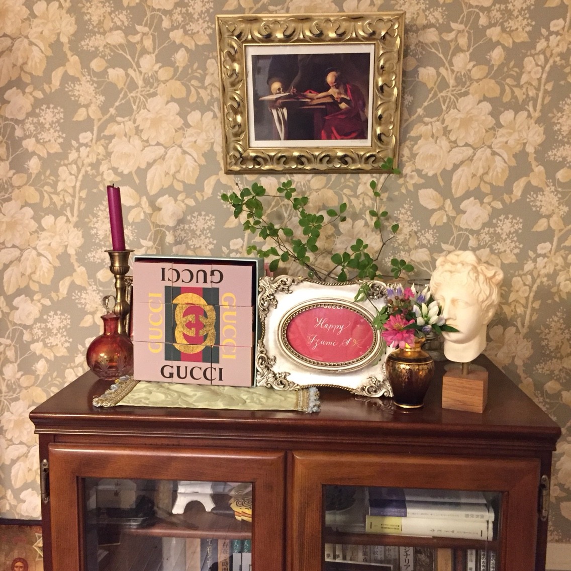 カリモクのブックシェルフの上、フレームのカードは5月にやはりGUCCI銀座で描いていただいたイタリアの花文字職人さんによるオリジナルカード。庭のさるすえりや白い竜胆を、ヴェネツィアングラスにいけて。