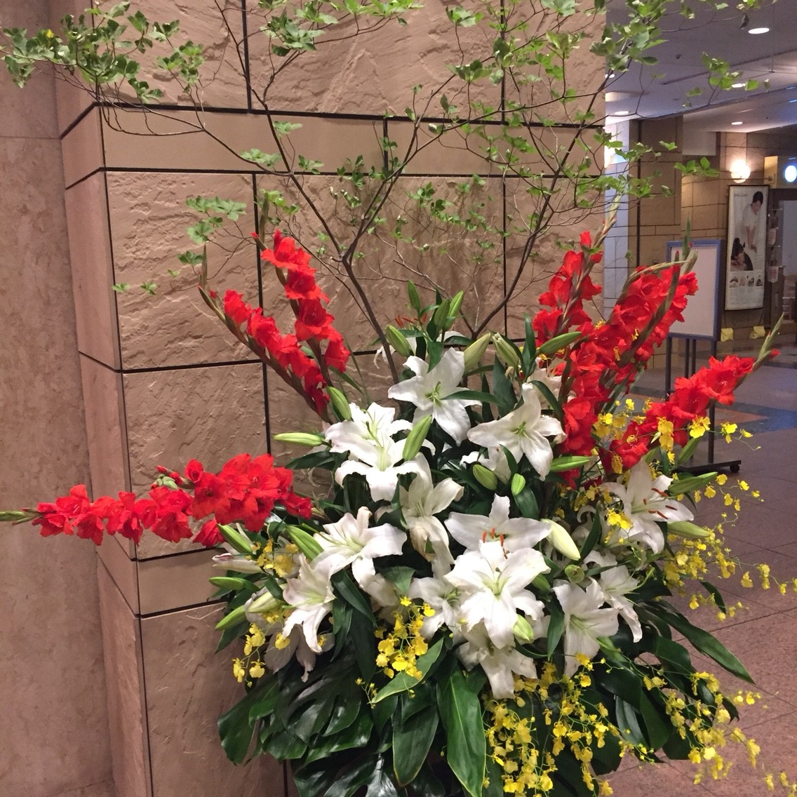 エントランスのお花はグラジオラス、ドウタンツツジほかがいけてありました。