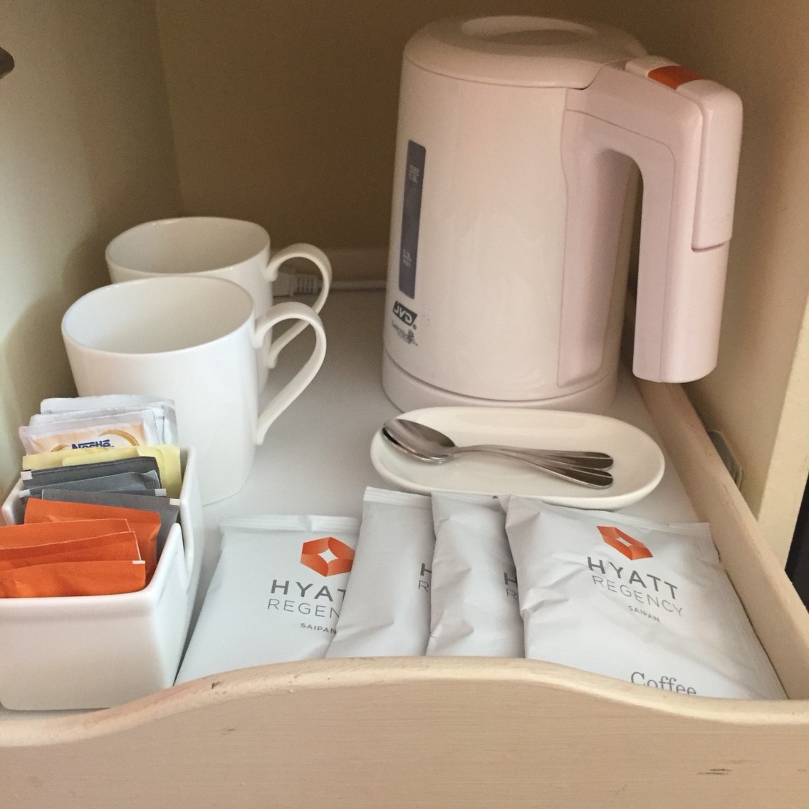 湯沸しポット常備です。ハイアットのコーヒーも、マグ、グラス数種と部屋でコーヒーや持参した紅茶などは飲めます。ロビー階にデリがあるので、サンドイッチやケーキなどは持ち帰って部屋でお茶できますね。