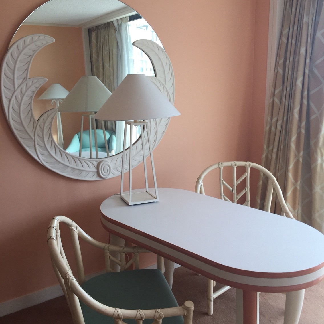 このペールオレンジの壁紙とホワイト基調のインテリアカラーリングは気に入っていて13年前に泊まってから自宅も一部屋このイメージでインテリアコーディネイトしました。