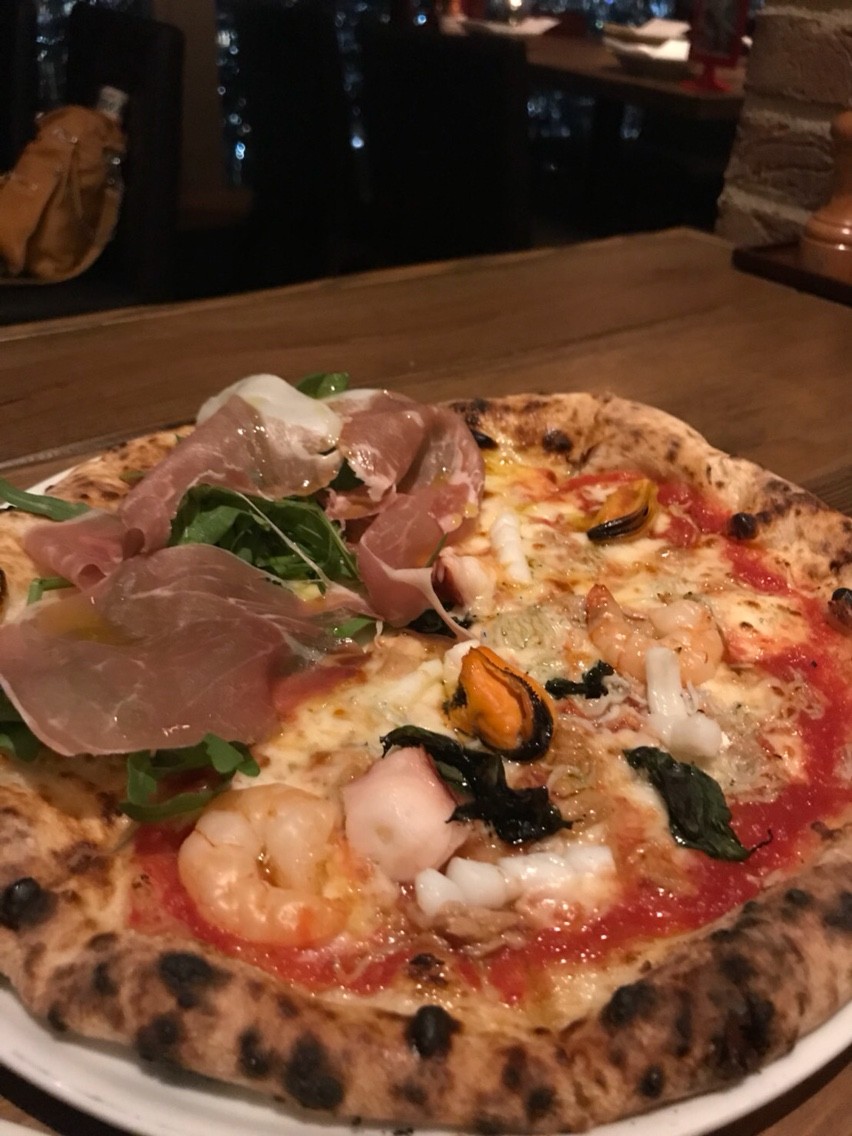 ナポリピッツア、ハーフ&ハーフで再度、今回はルッコラとプロシュート、魚介のピッツア。