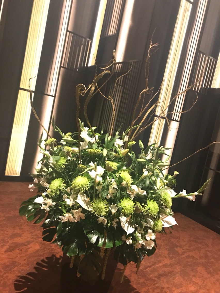 エレベーターホールのお花も変わっていました。こちらも百合、グラジオラス、トルコキキョウなどピンク=グリーンできれいでした。