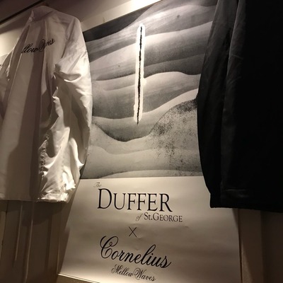 ロビーにDuffer × Cornelius のコラボデザインの服の数数が展示されていました
