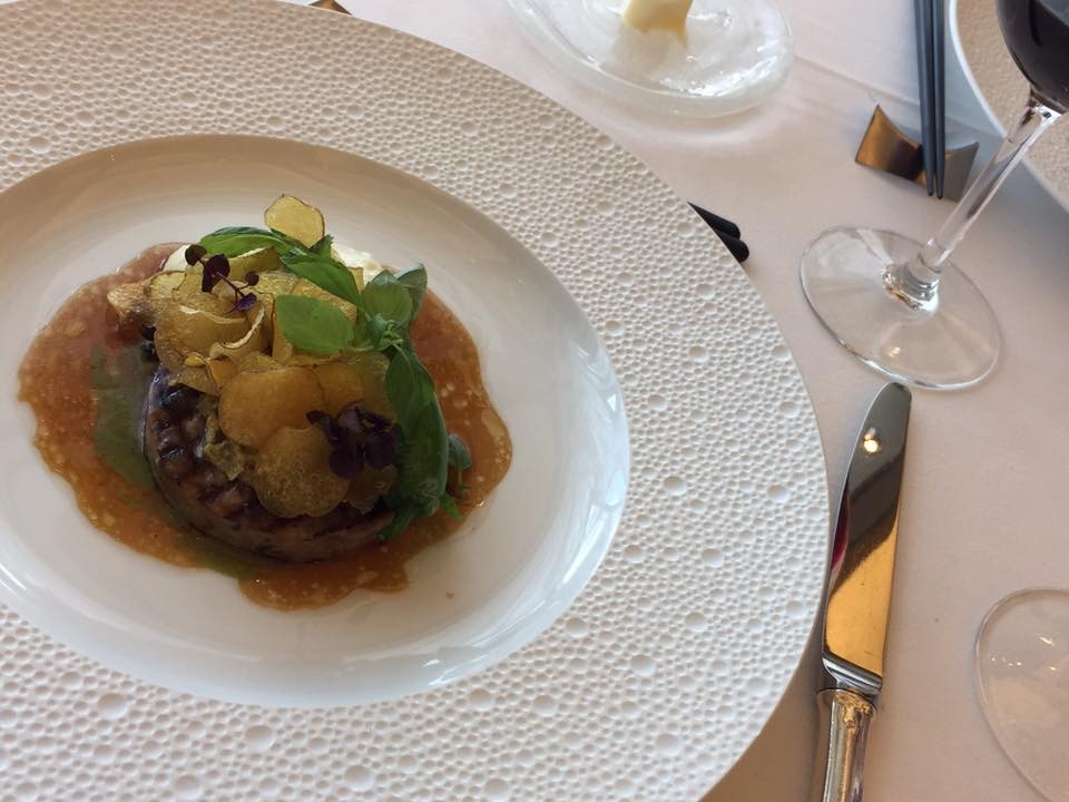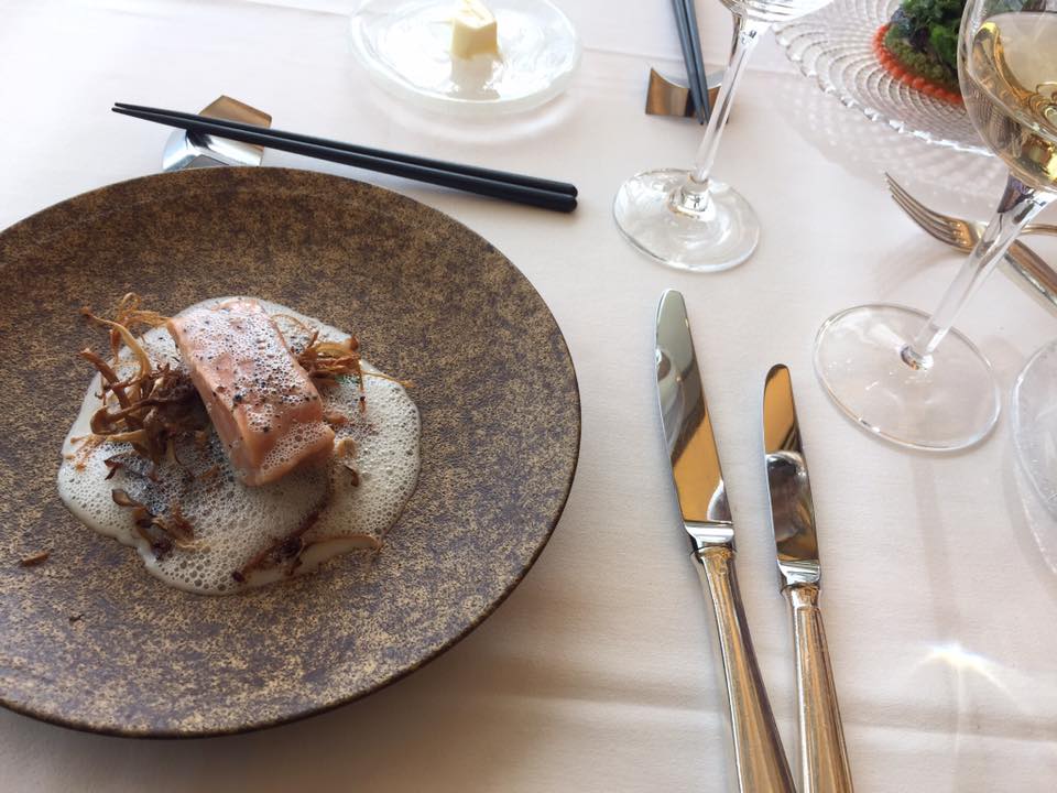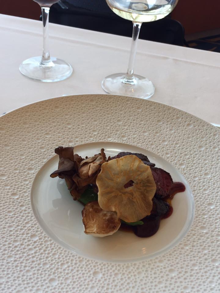 茸の香りと風味がぎゅっとつまったサーモンのポアレ。火の通り方といいきのこの香ばしさといい風味が豊かです、ソースが白ワインのソース。セレクトしていただいた白ワインで当然あいます。