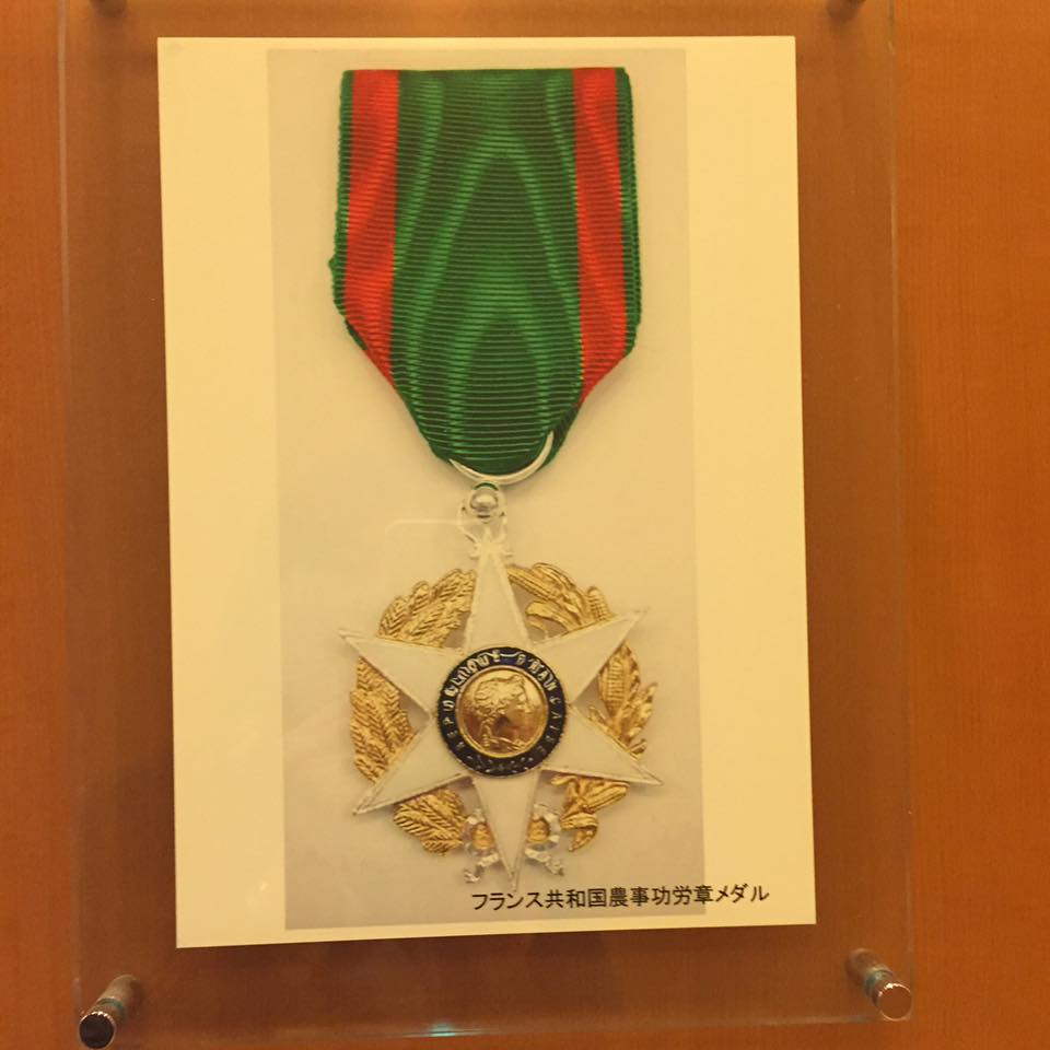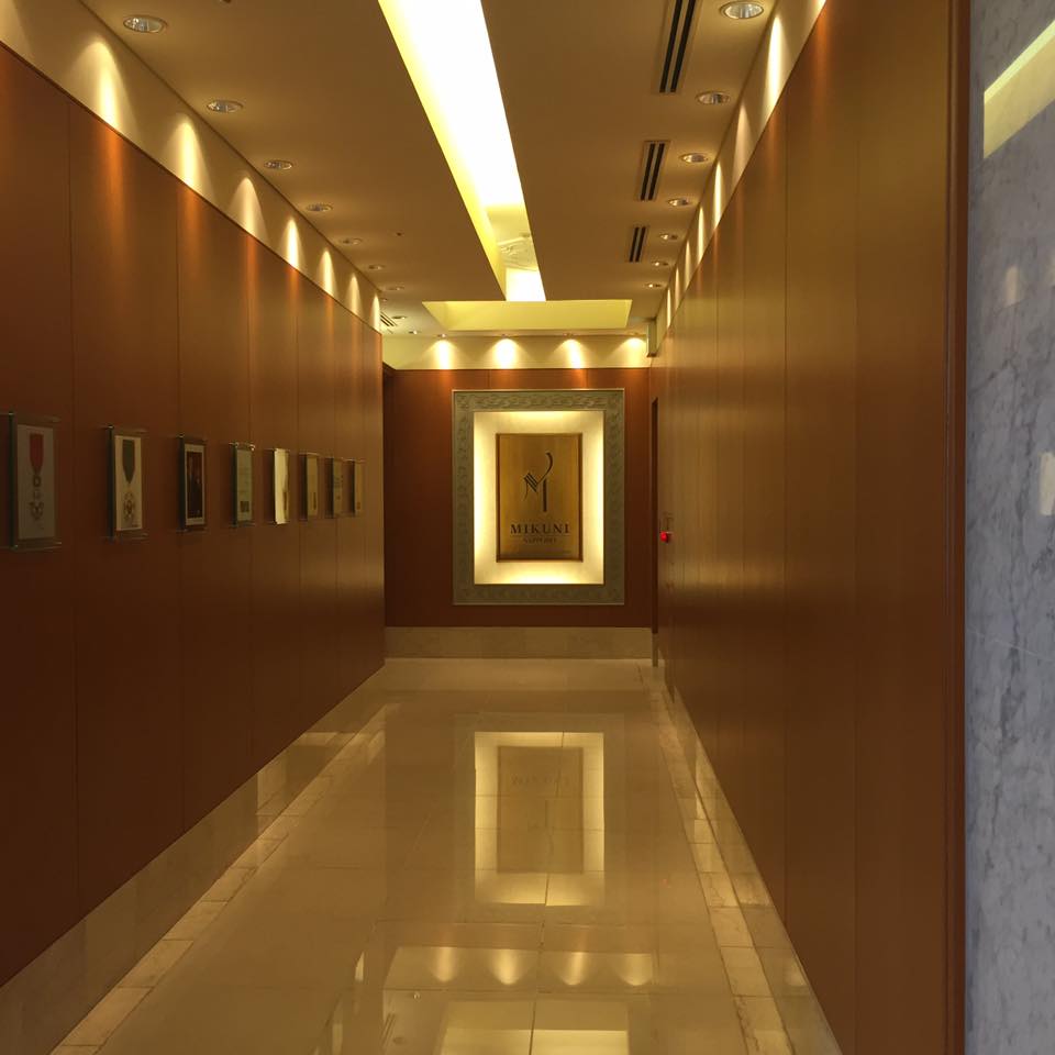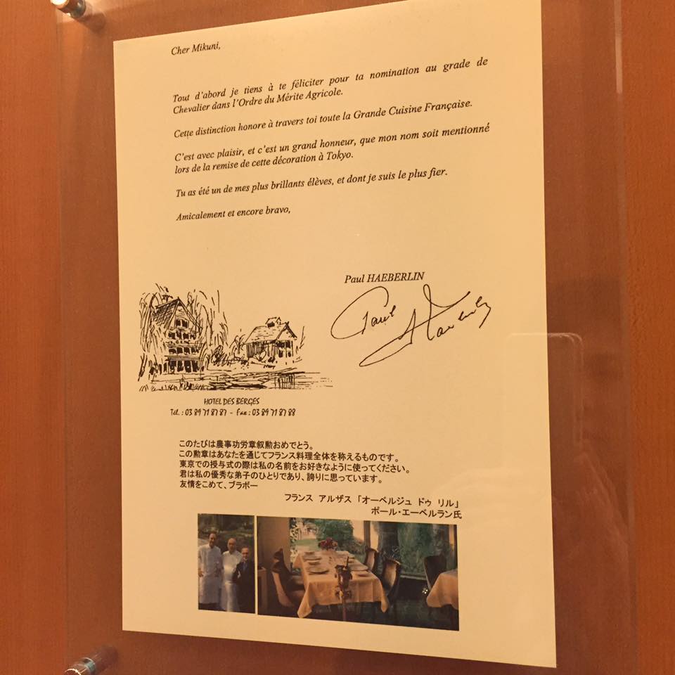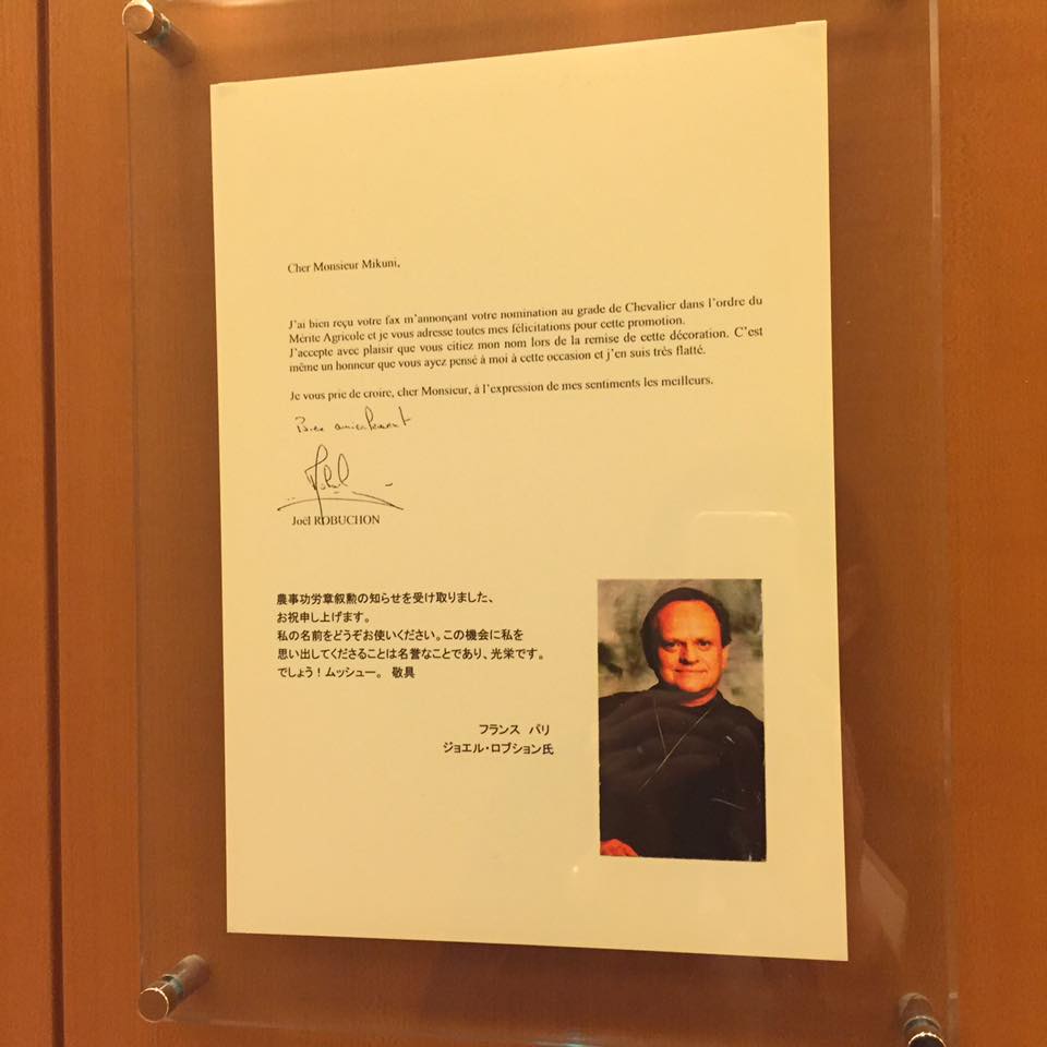 ステラプレイスの9階からエントランスへの通路には、ロブション、フランス大使、功労賞メダルなどの写真も。