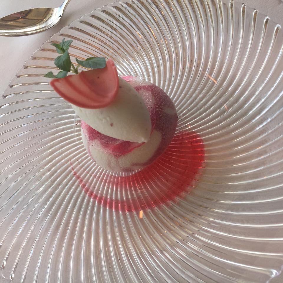ジンジャーエールのゼリーに赤すぐりなどがはいっています。薔薇のアイスクリーム、ガナッシュ、カシスのケーキ。