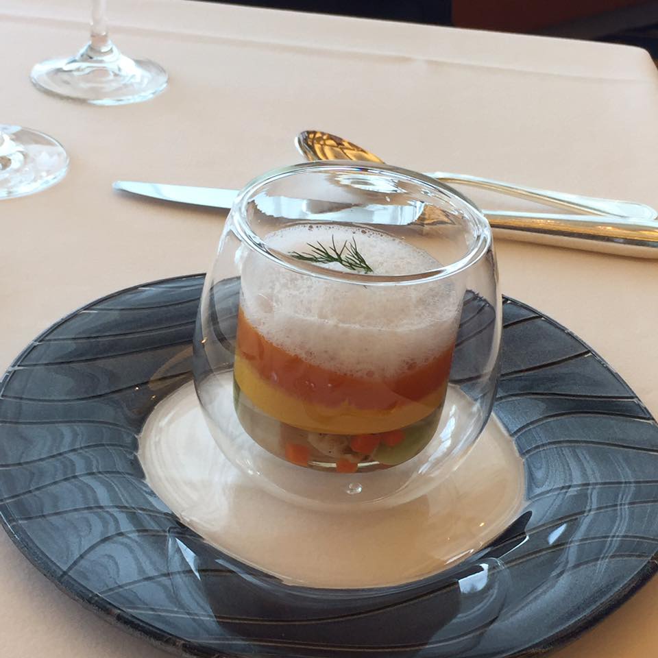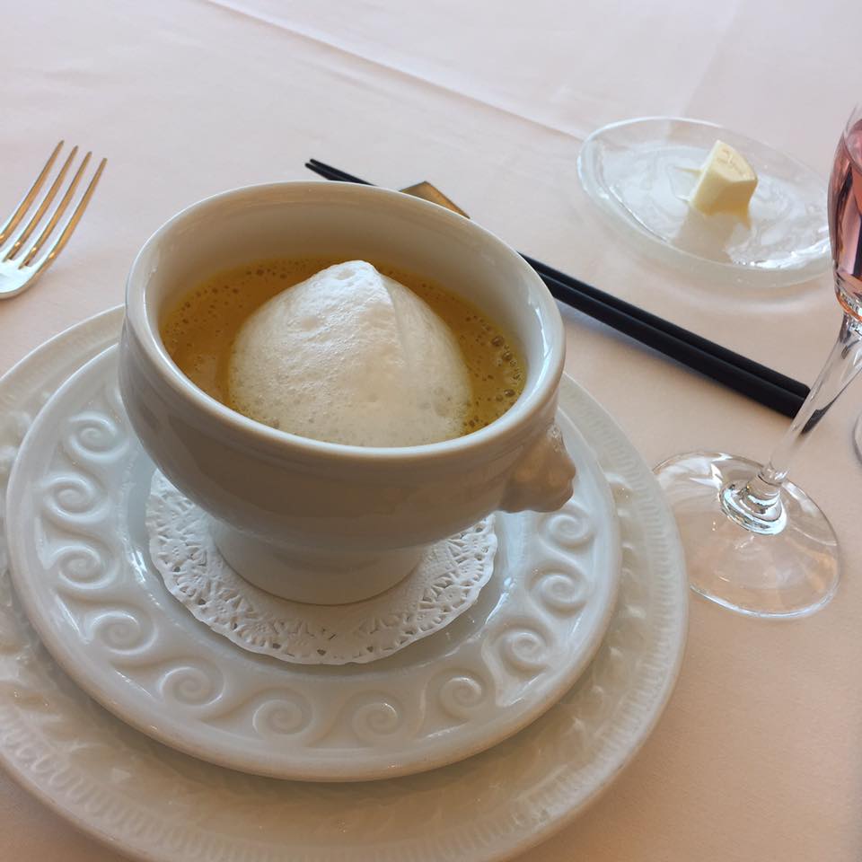 こちらはあたたかい前菜のフランが入ったカボチャのスープ仕立て。