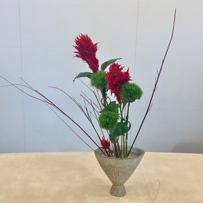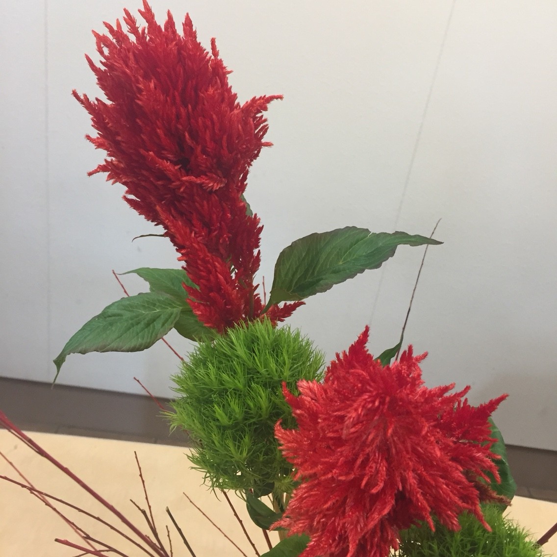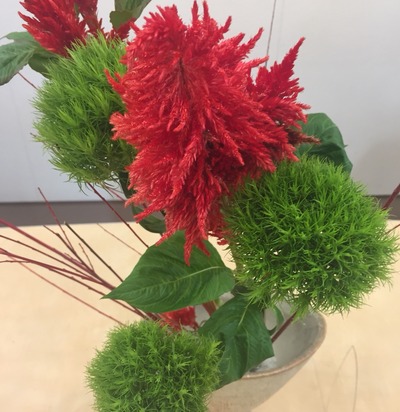 大きなけいとうで、赤色があたたかみがあるので、その質感にあわせててまり草を選んでみました。