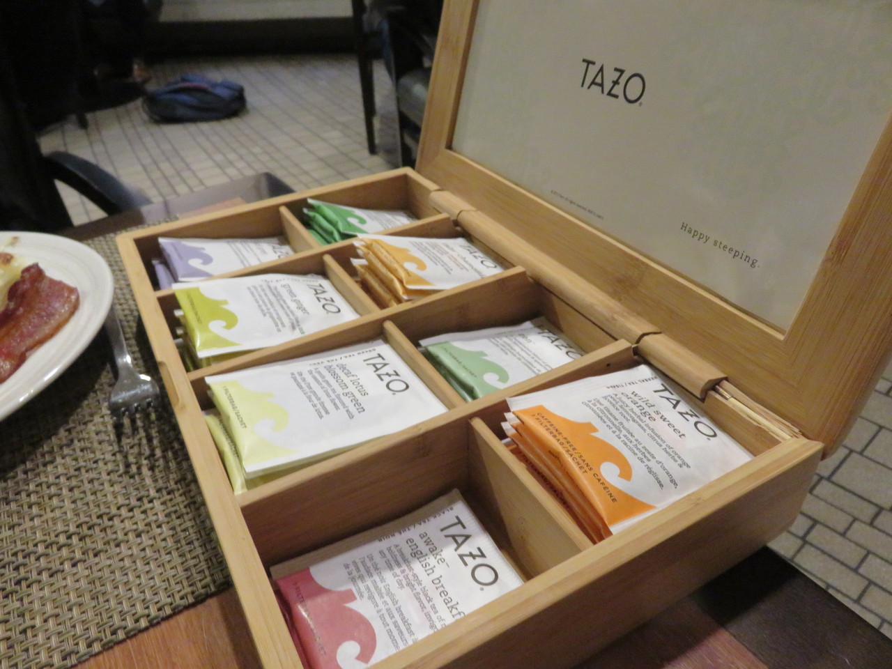 LAといえばコーヒー...なのでしょうが、やはり朝はミルクティーとダージリンが飲みたいということで、Black Teaをお願いしましたところ、TAZOのティーセレクションを箱ごと出してきてくれました。