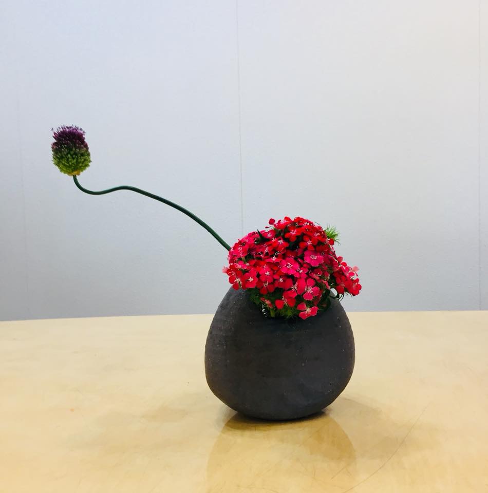 マッスの時は菊とスイトピーにしたので、なでしこと丹頂アリアムでお稽古しました。