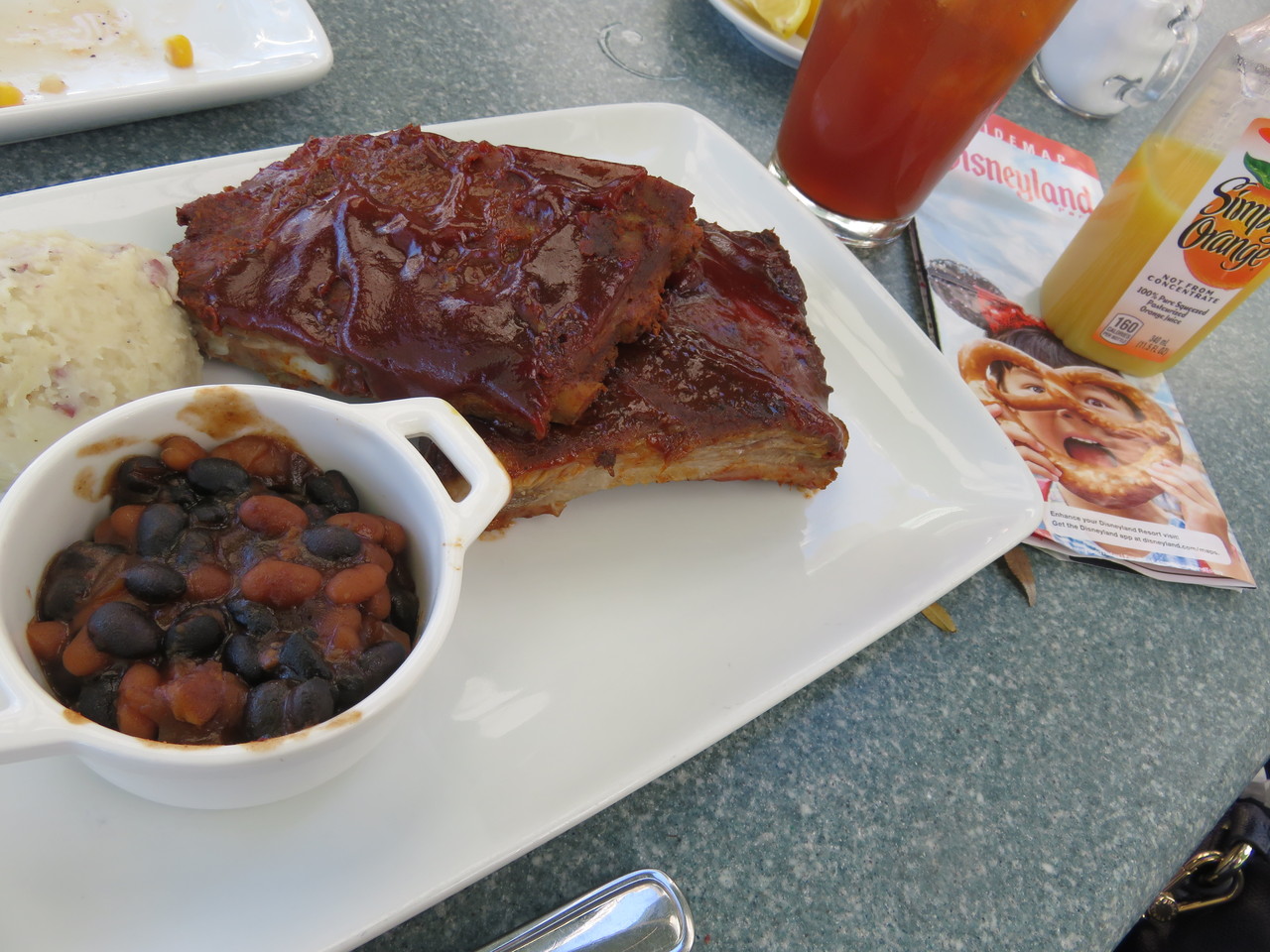 アイスティーと、バーベキューリブ、ベイクドビーンズ。アイスティーはおかわりできると思います。