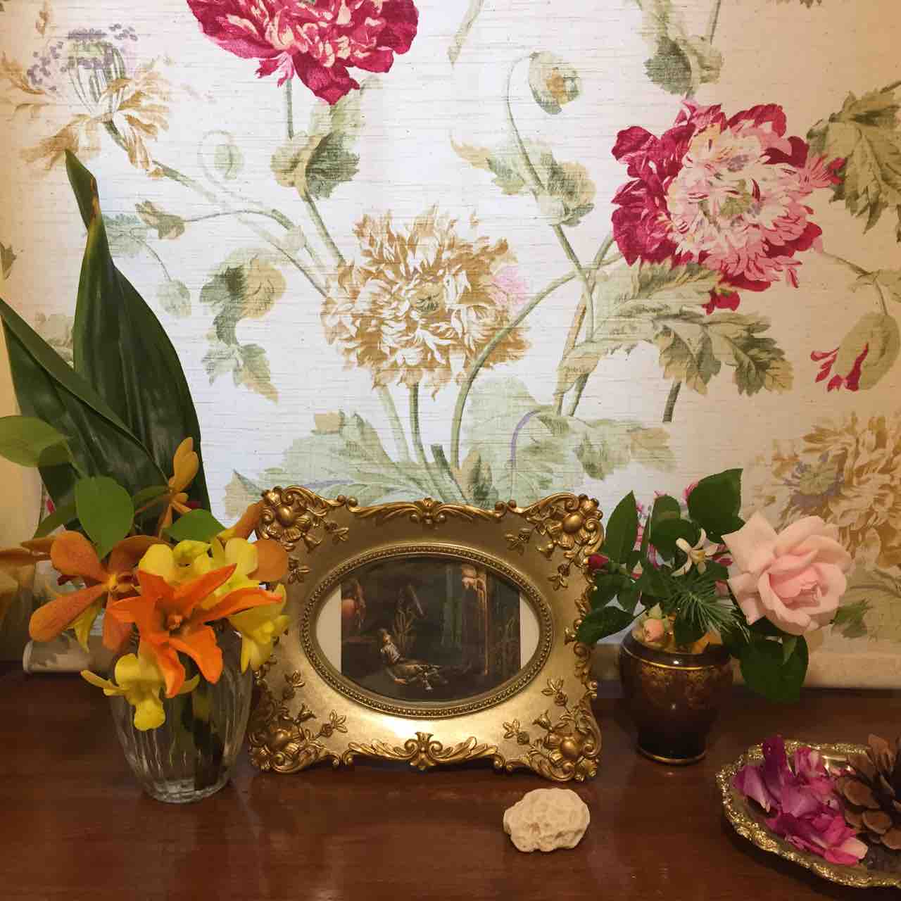 バーン・ジョーンズのカードに変えまして、タイフェアでみつけた蘭(デンファレ)と百合、おもとをあわせたものと、New Dawnとレモンの花、バロン・ジロー・ラン、ブルーベリーリーフをあわせてかざりました。