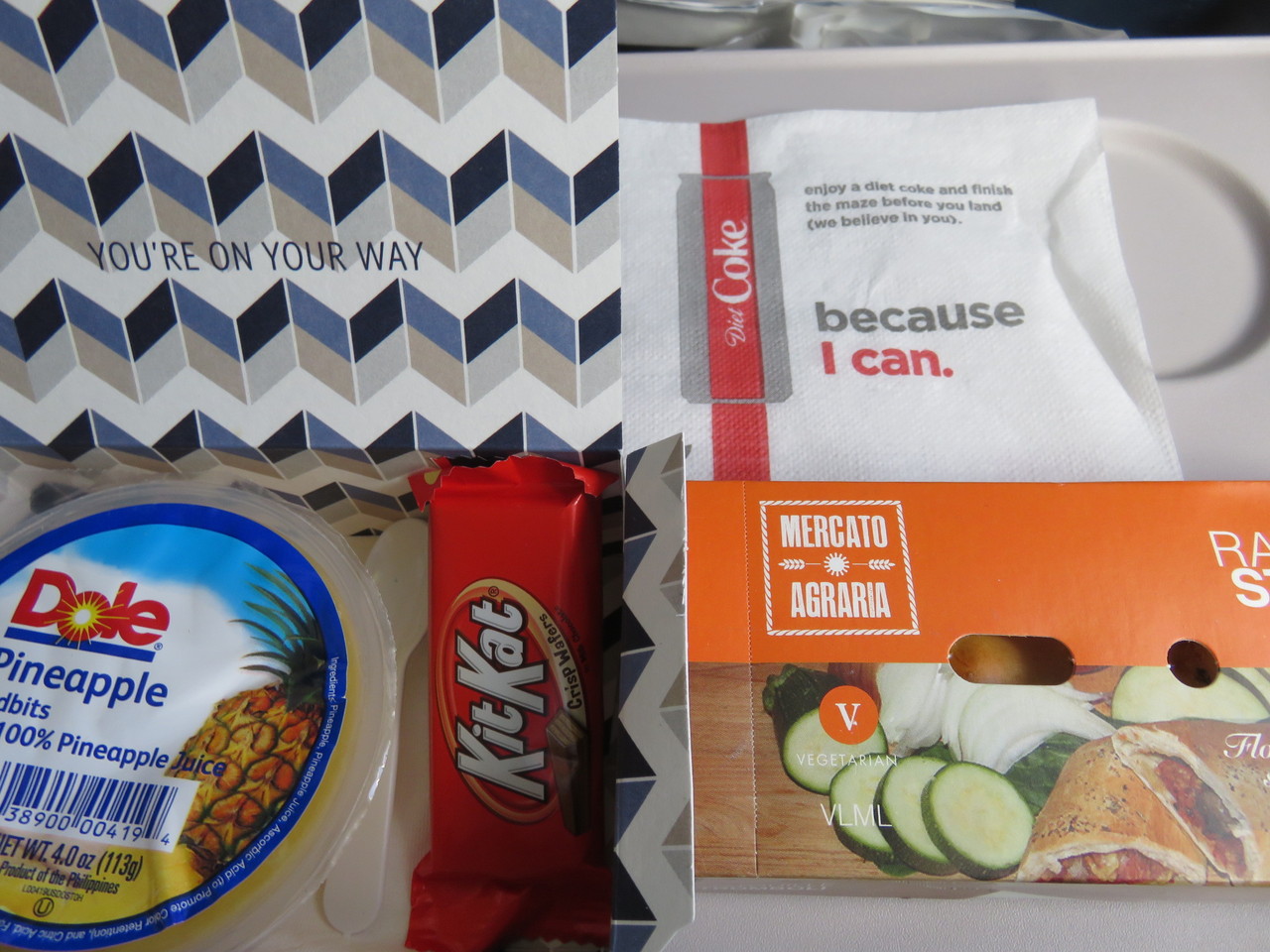 リフレッシュメントのパイナップルのカット・フルーツとラタトゥユの惣菜ロール風。キットカット。このほかにアイスクリームのサービスもあります。