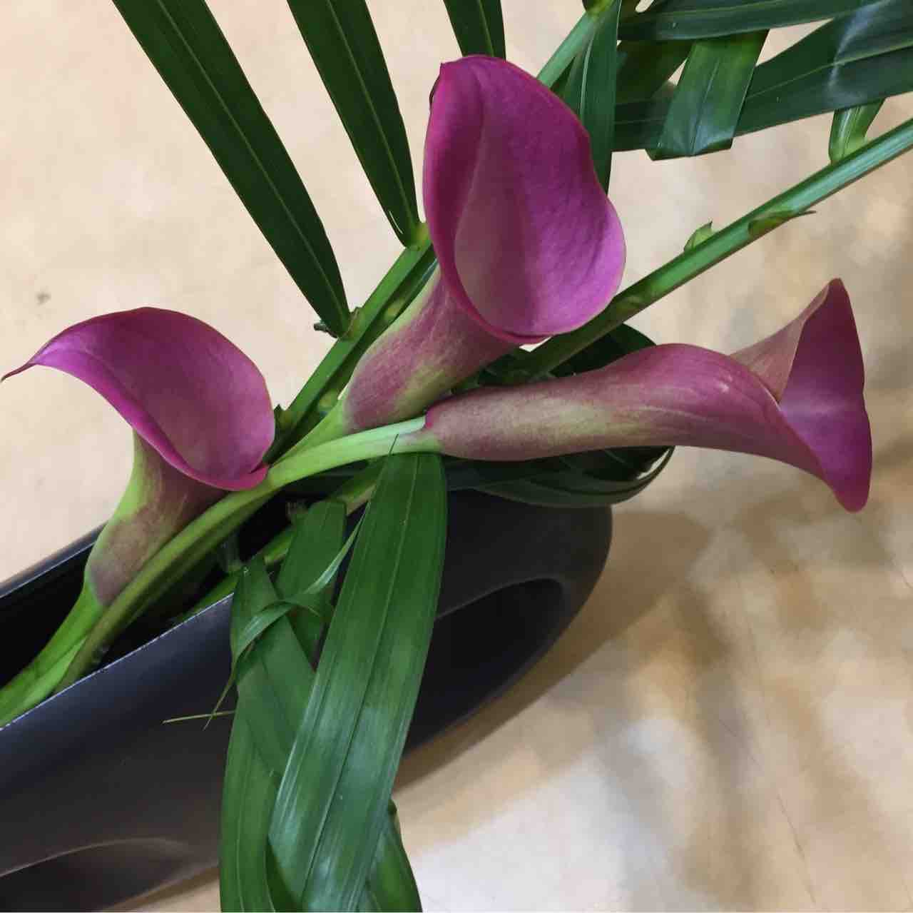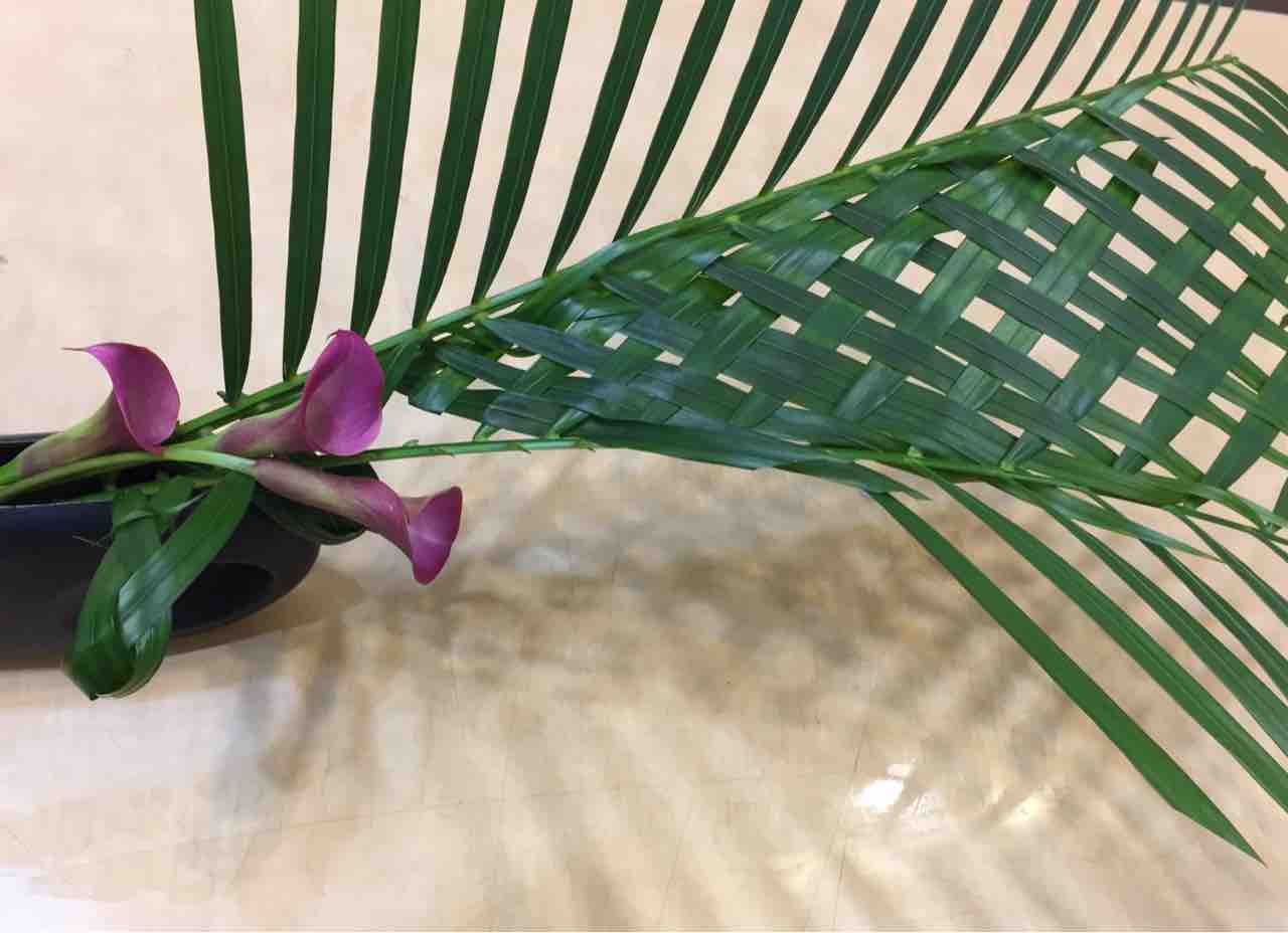 いけばなお稽古でカラーとヤシをいけました。植物を編むというテーマです。