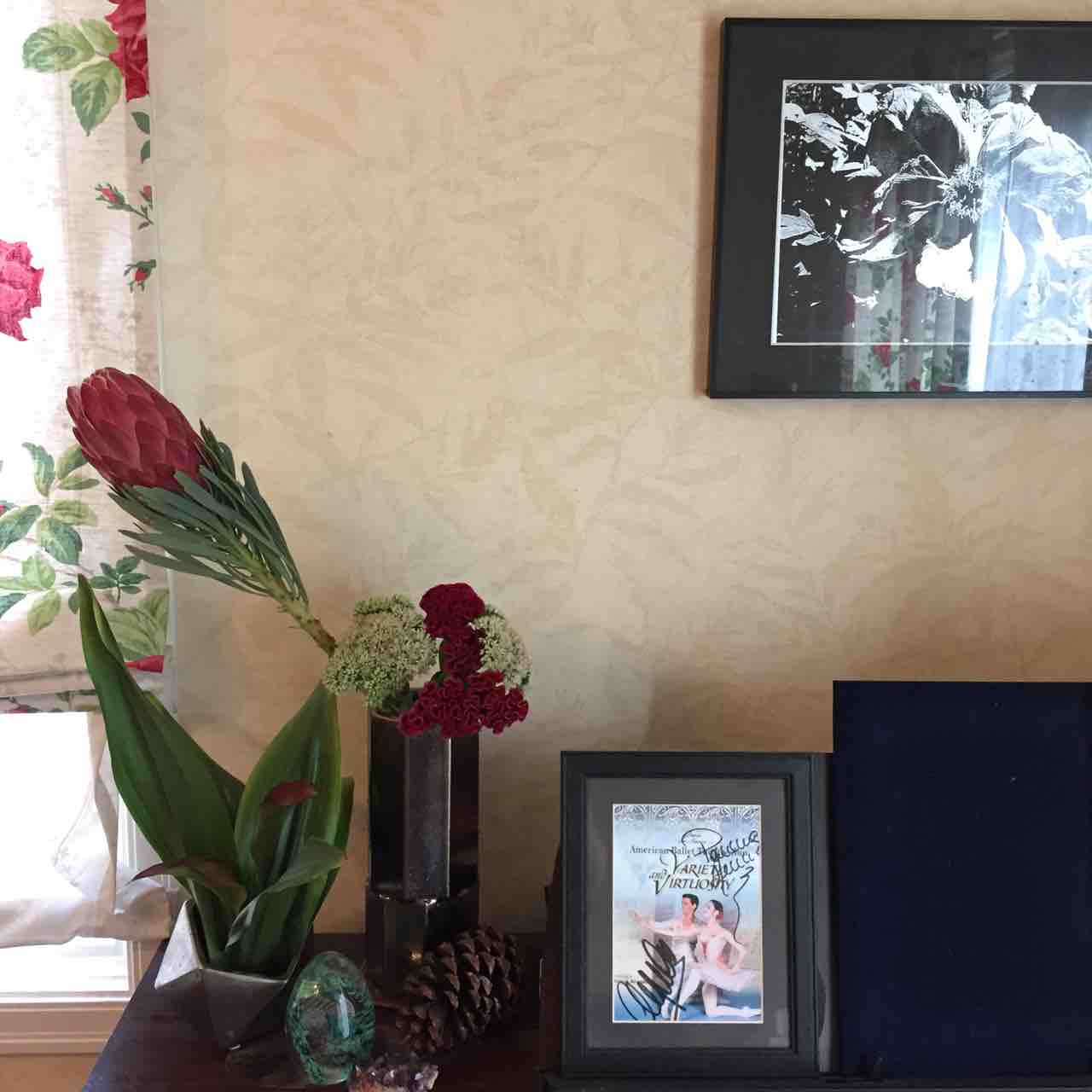 ダイニングの窓際のピアノ上に先に記事にしたプロテア、ケイトウ飾りました。