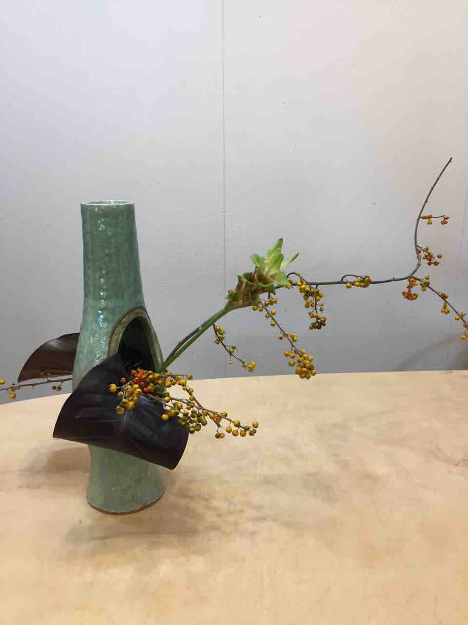 花器も、お稽古場の生花店さんの花器をお借りしています。長年みていた器なのですが、つるとあわせてみようと思いました。花器の色やつるうめの風情から・・・