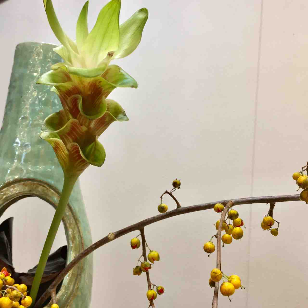 つるものの習性をいかして作品をつくる。当初はもうすこしつるものを花器に立てるような感じのつろを想定してましたが最終的にはこの形に。クルクマを花器にどういかすか、フィロデンドロンをどういかすか、等々。