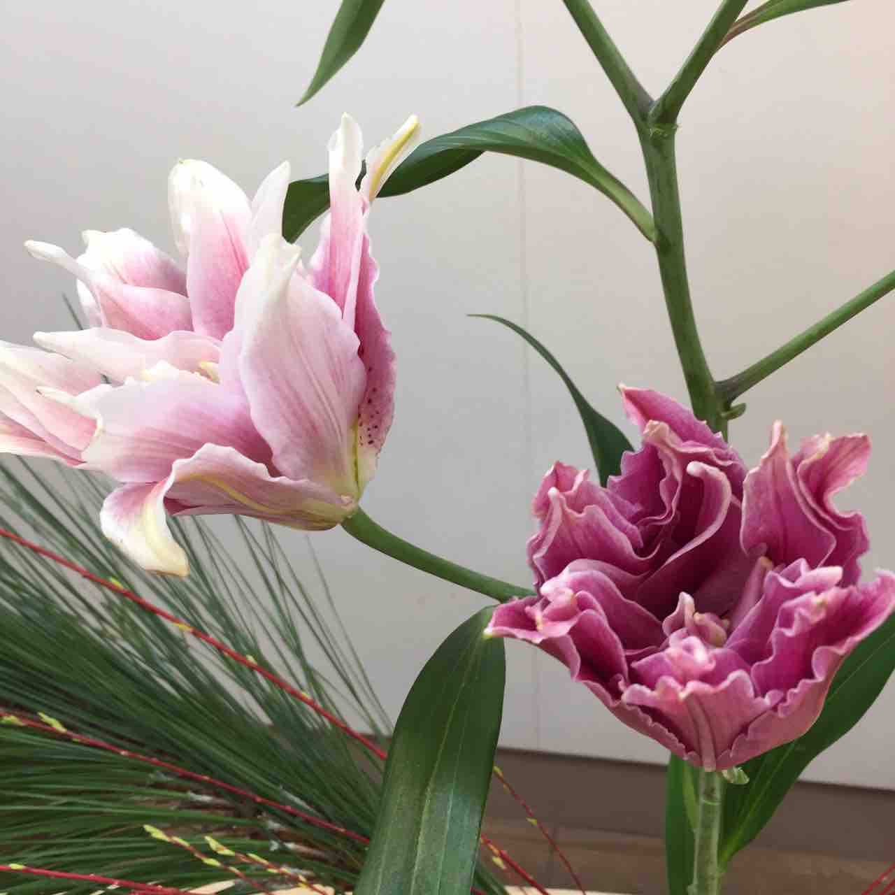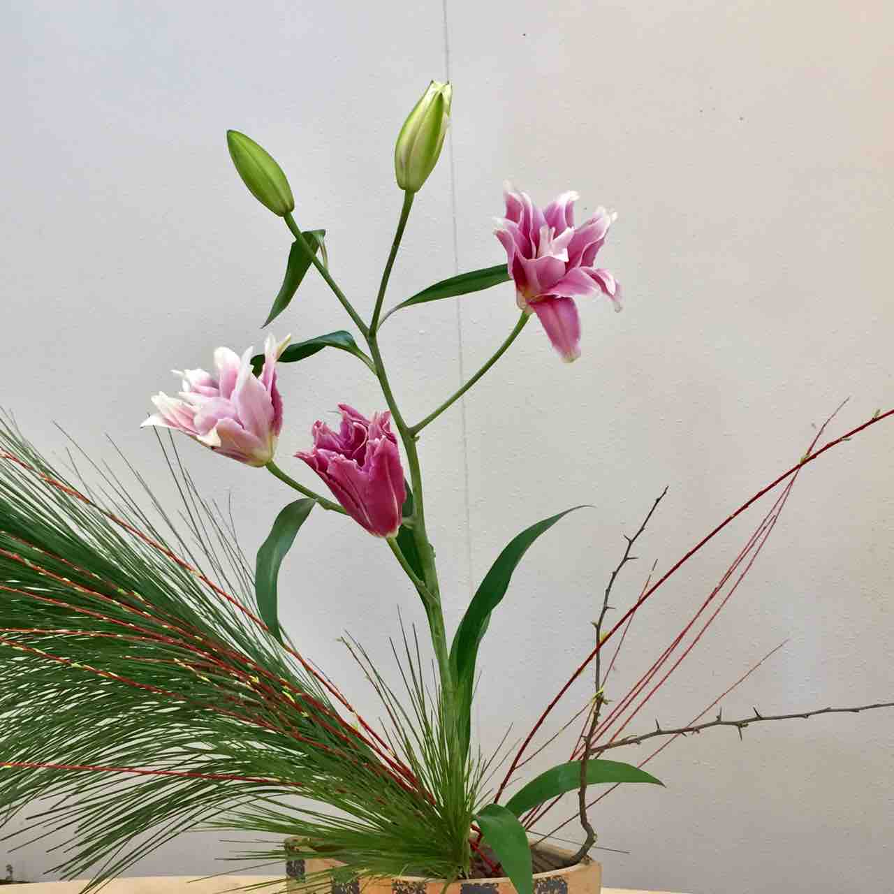 ホリデーシーズン、クリスマスから新年にかけて...をテーマに八重咲きの百合が美しかったので大王松 だいおうしょう をいけました。