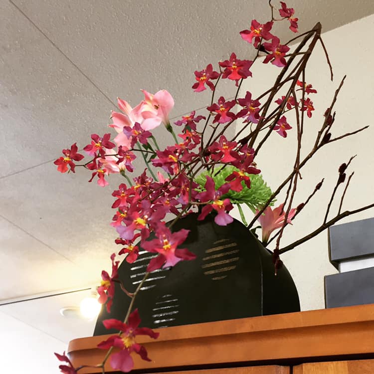 下からの目線を意識していける課程です、チェリーレッドのオンシジウムと黒芽やなぎを中心に、アルストロメリア、アナスタシア(洋菊)をポイントに使いました。