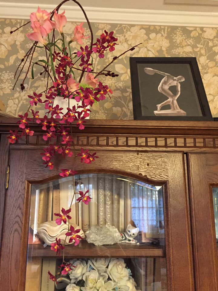 チェリーレッドのオンシジウムは自然にしなだれる形をいかして。