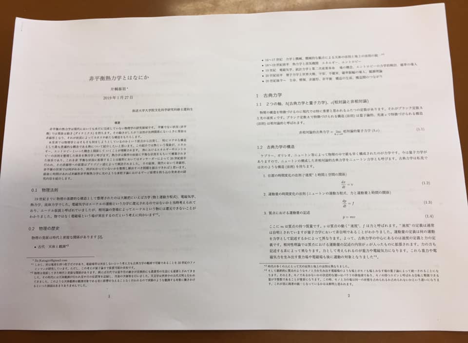 発表者は片桐奏羽さん。小又志郎さんの発表の時に参加されて、その後も物理関連の話を少し聞いていたのですが、2017年に英語論文を発表されたので、この機会に是非ということで発表していただきました。