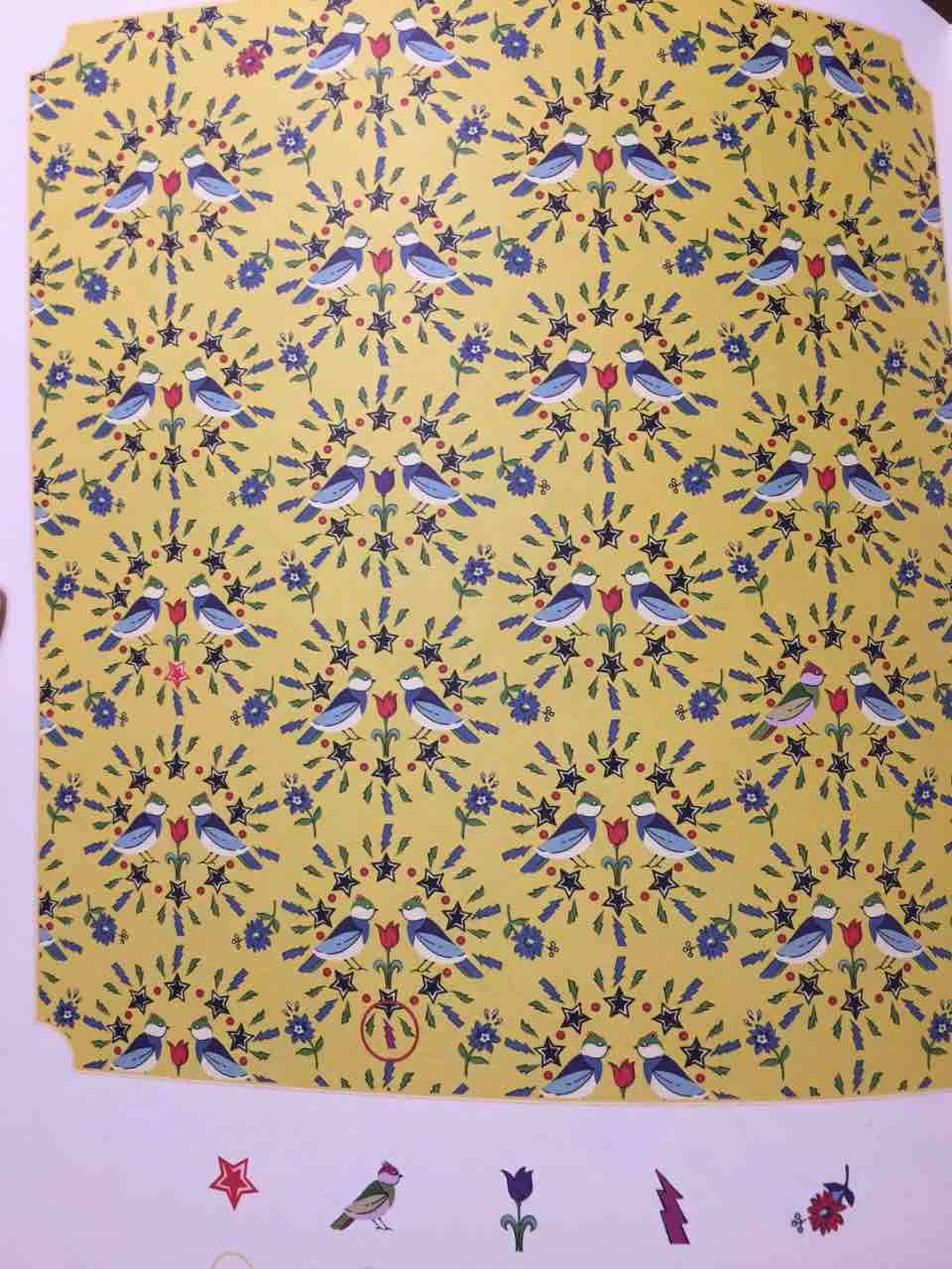 ブルーバードとチューリップを配したモチーフのテキスタイル。