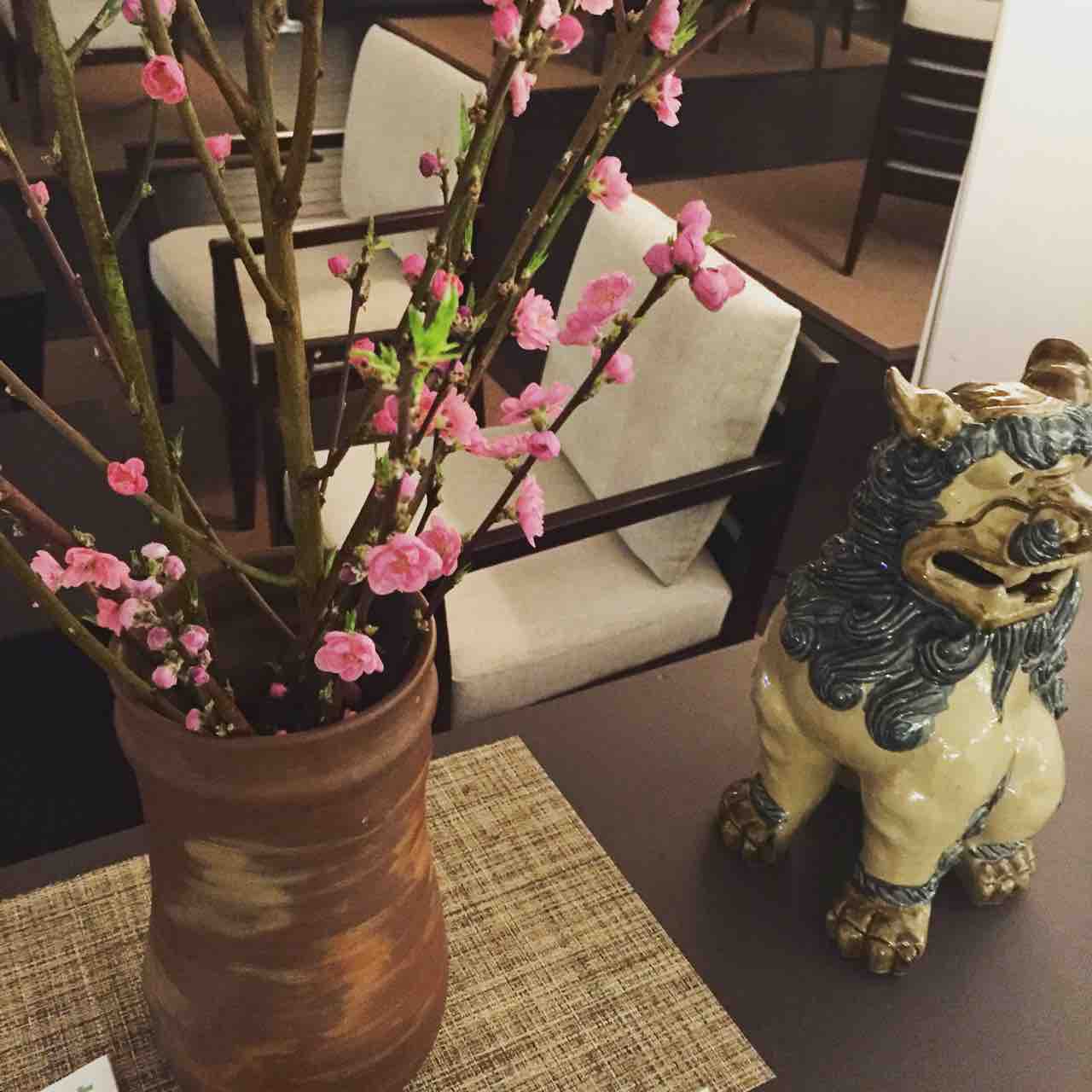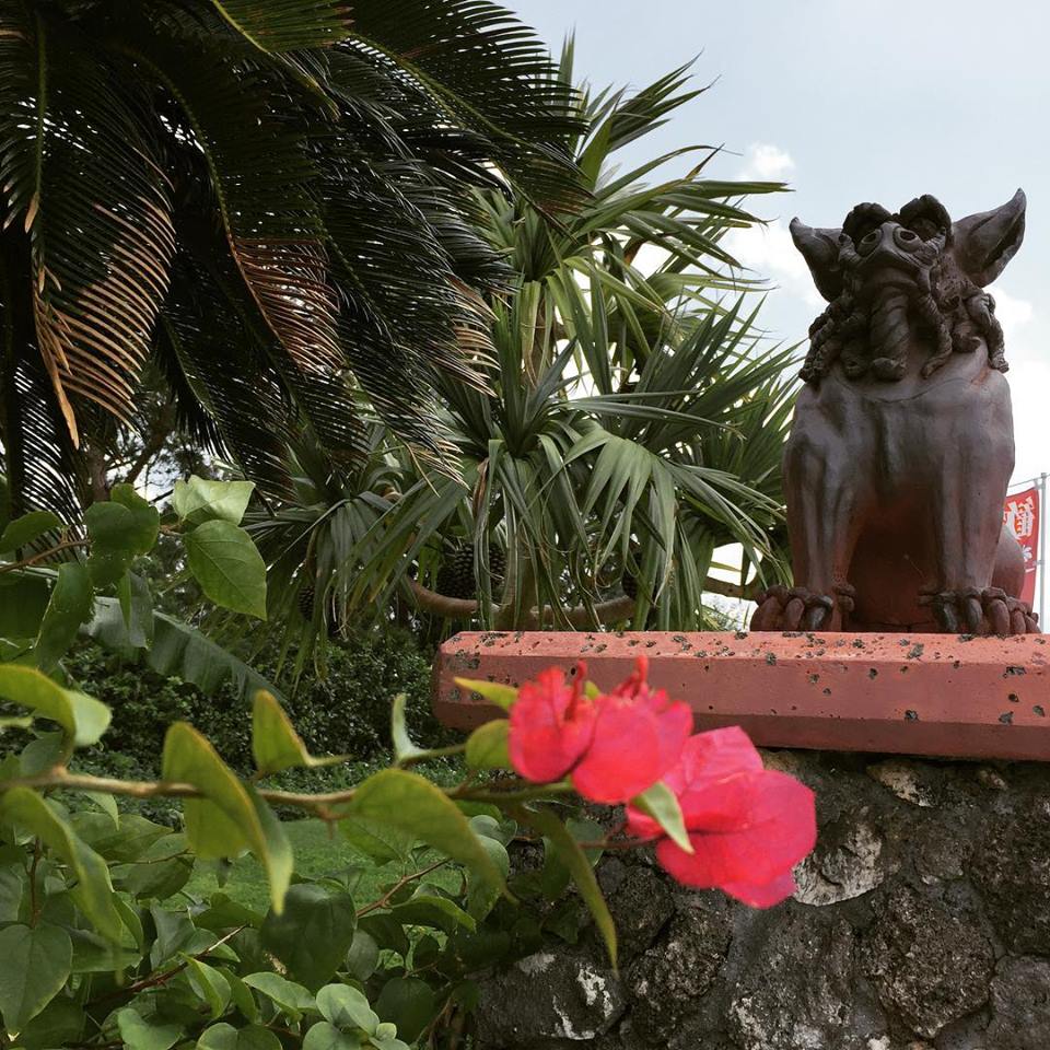 宿泊したイーフビーチホテルの門にあるシーサーとハイビスカス 赤花。