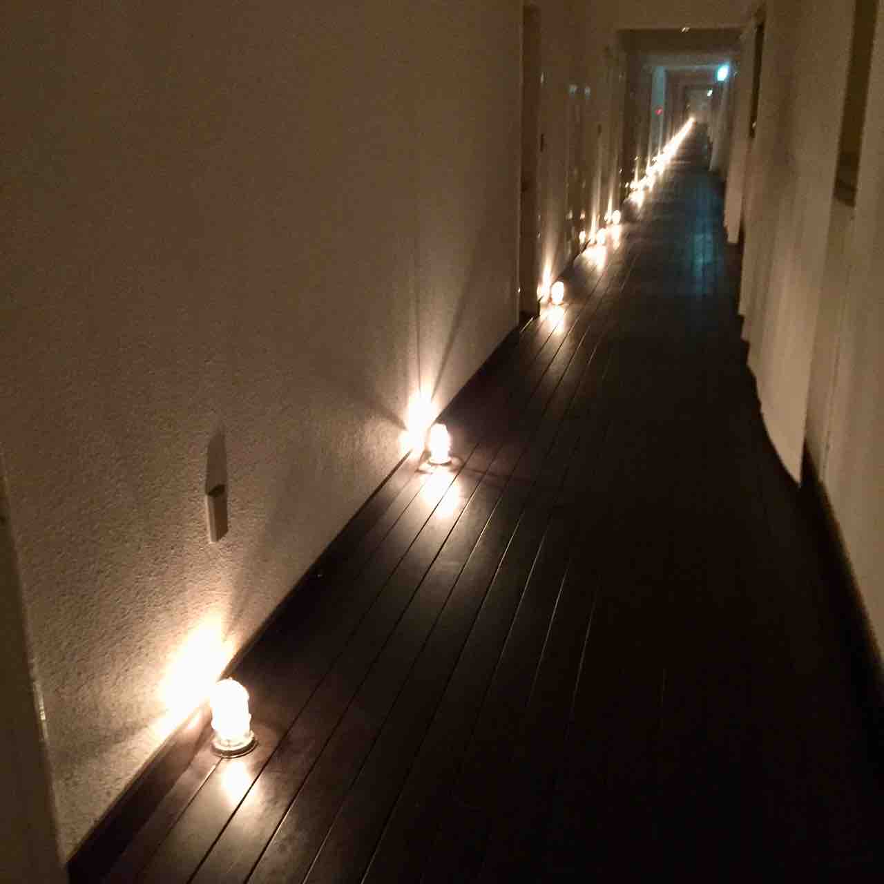 廊下は夕刻になるとマリンライトが点灯します