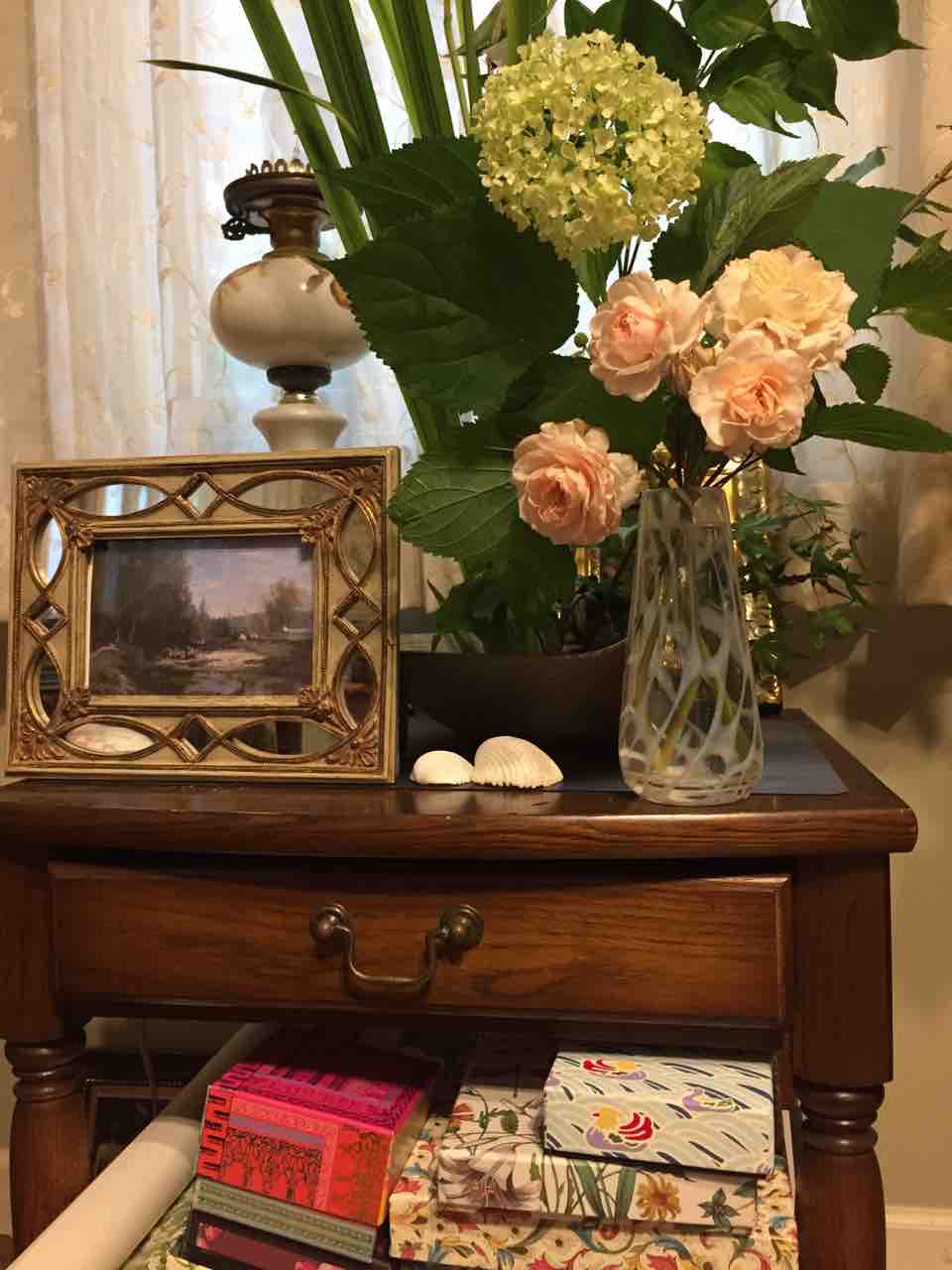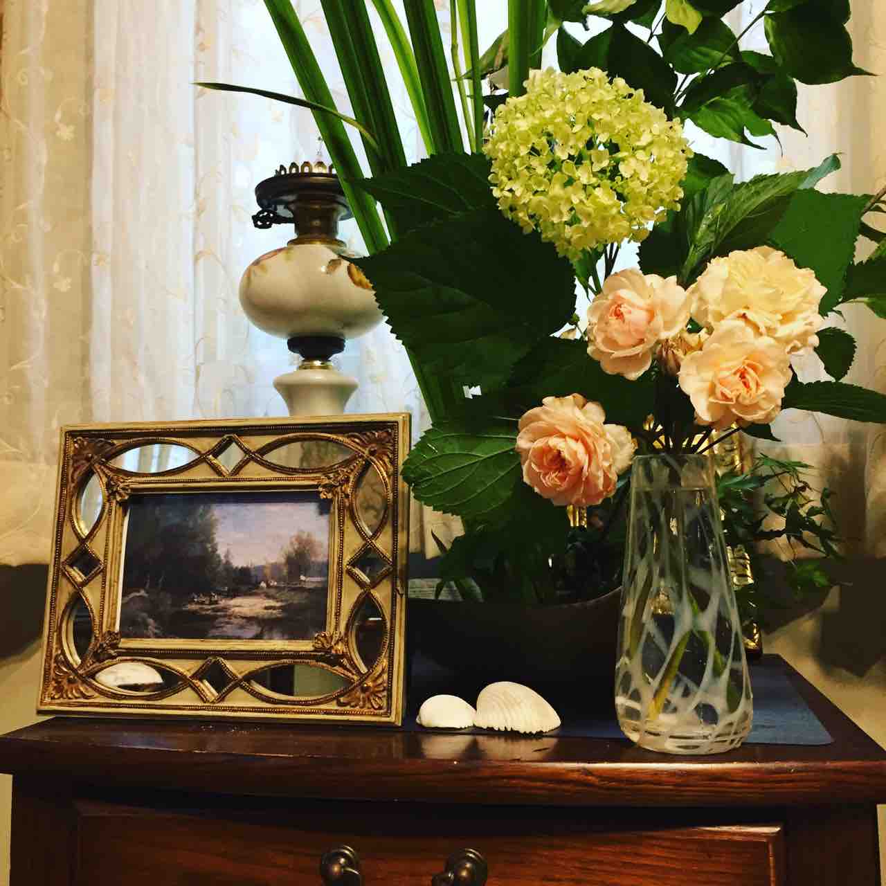 ドービニー展で買ったカードを飾りまして、アナベルが咲いて来たのでいけた写真です。