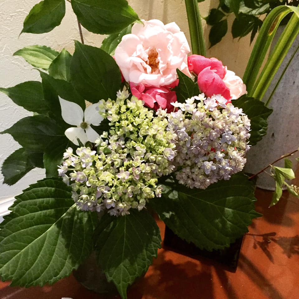 山法師と紫陽花、ばら2種。