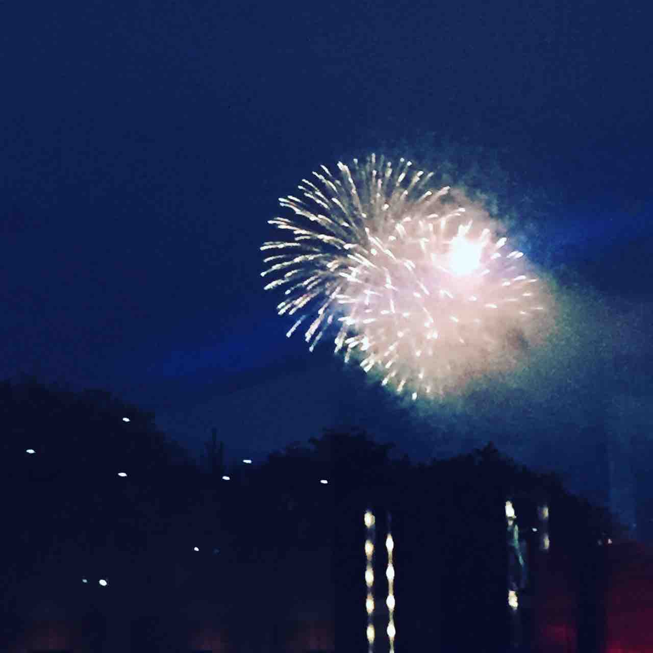 写真はヒルトンのエントランス付近からみえる花火。